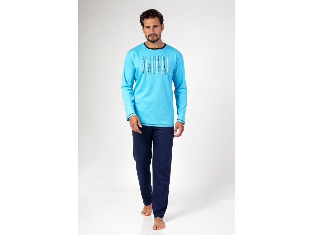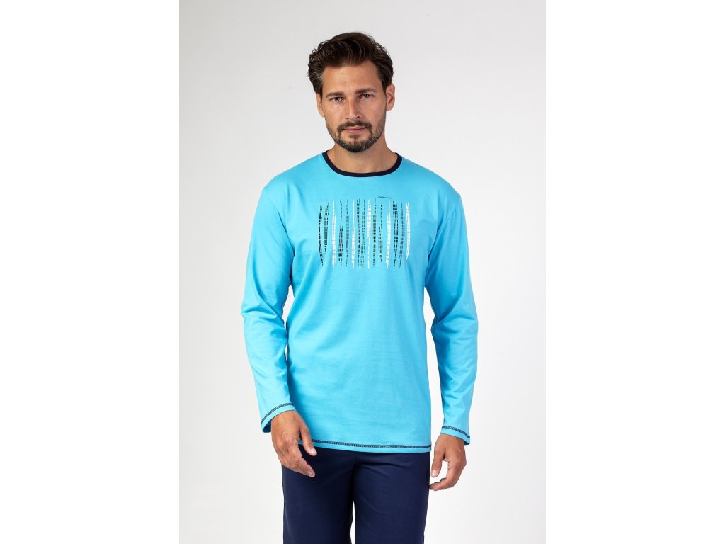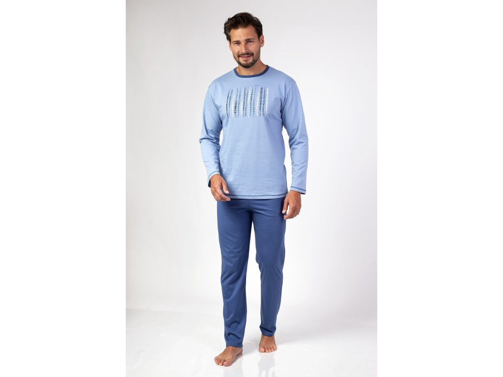 Pánské pyžamo 472A ● z přírodní bavlny ● s dlouhými rukávy a dlouhými nohavicemi ● s půlkulatým výstřihem zakončeným elegantním záhybem ● s hladkým horním dílem s ozdobným potiskem ● spodní část a rukávy košile s ozdobným prošitím ● jednotné kalhoty klasického volného střihu ● úplet je měkký na dotek a jemný k pokožce