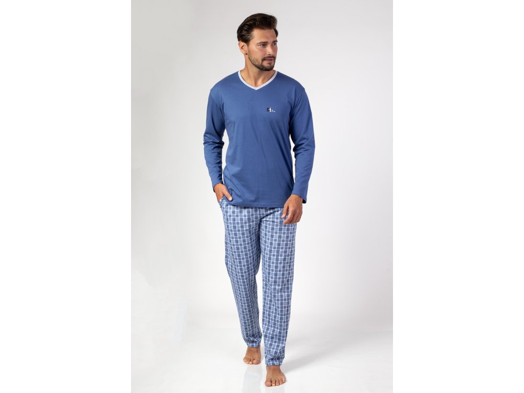 Pánské pyžamo 473A ● z vysoce kvalitní bavlny ● dlouhé rukávy a dlouhé nohavice ● přední díl s ozdobným drobným potiskem ● jemný špičatý výstřih s kontrastním ozdobným lemováním ● rovné kalhoty v módním kostkovaném vzoru s kapsami