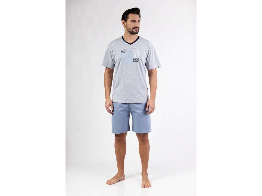 Pánské pyžamo 480 ● krátký rukáv s krátkými šortkami ● ze vzdušné bavlny ● halenka s potiskem ● výstřih s kontrastním lemováním ● hladké šortky doplňují sadu ● tkanina je příjemná na dotek a jemná k pokožce ● pohodlné a pohodlné