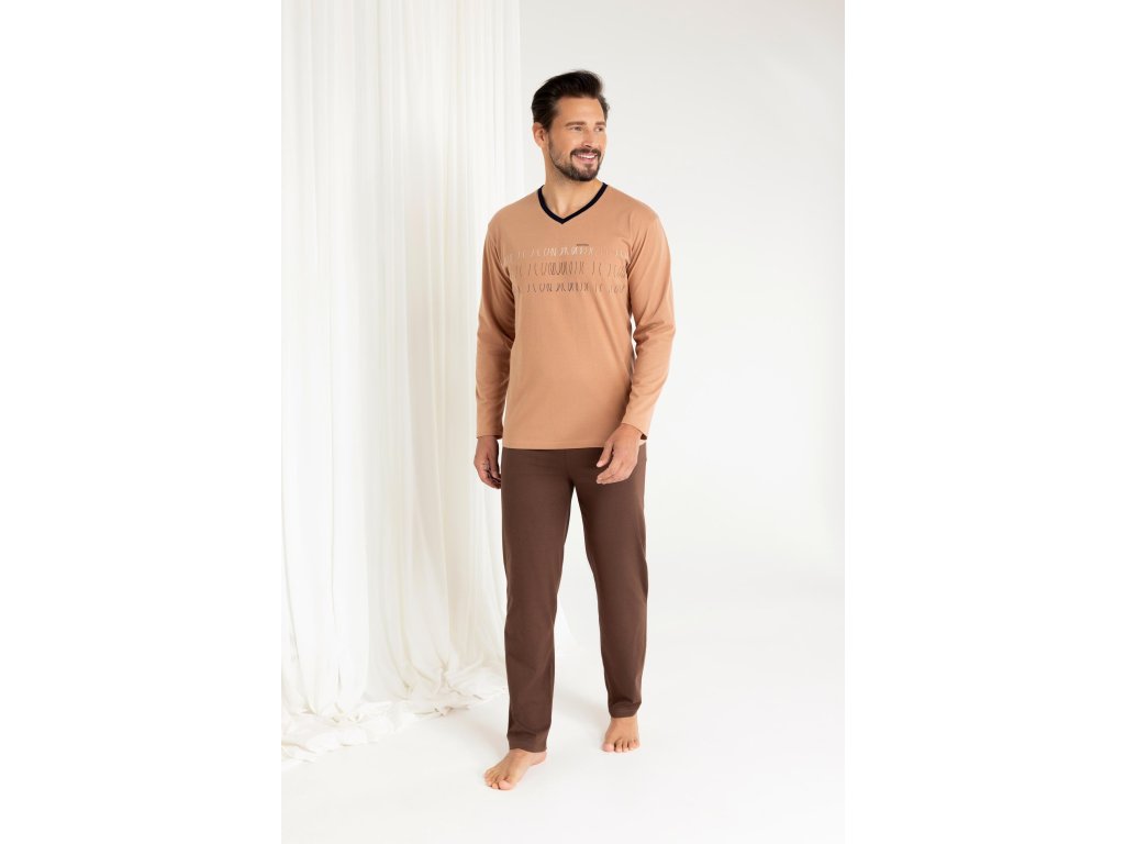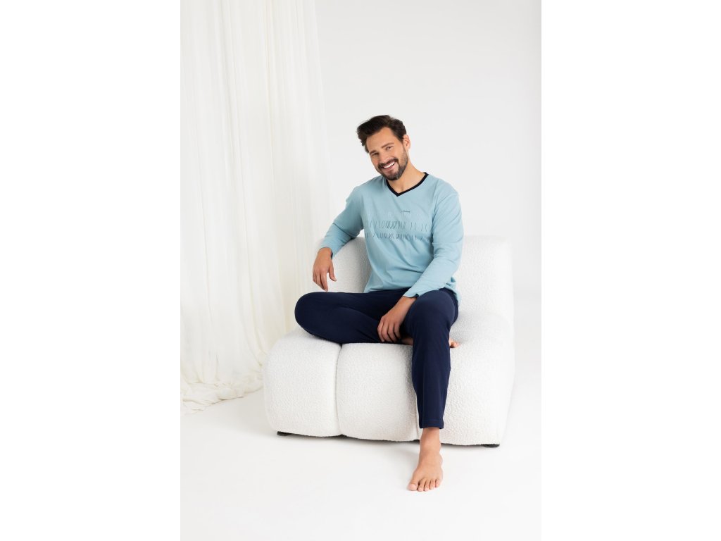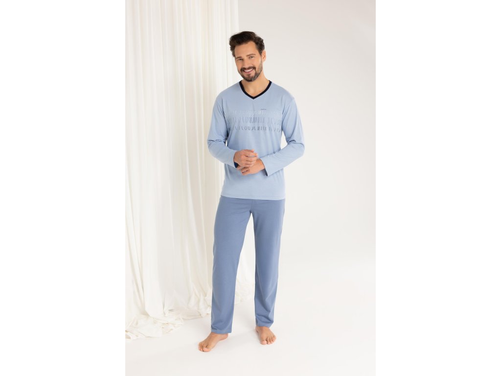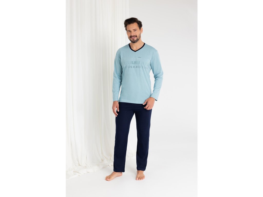 Pánské pyžamo 495 ● z přírodní bavlny ● s dlouhými rukávy a dlouhými nohavicemi ● výstřih zakončený elegantním záhybem ● hladký top zdobený potiskem ● hladké kalhoty klasického volného střihu ● úplet je měkký na dotek a jemný k pokožce