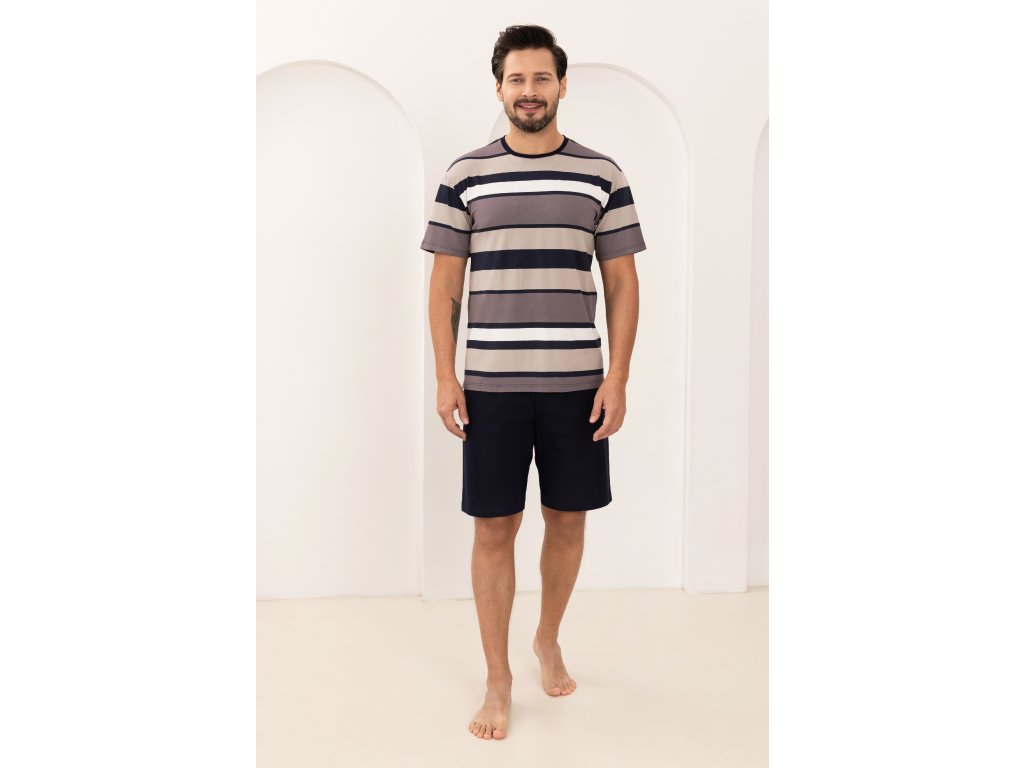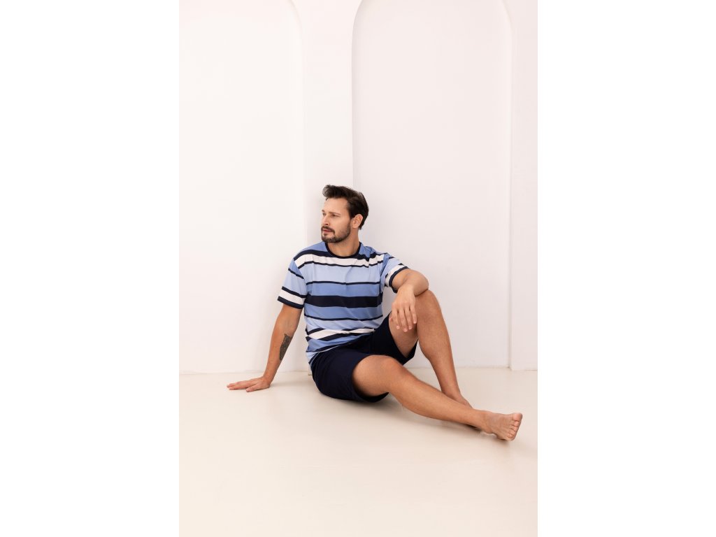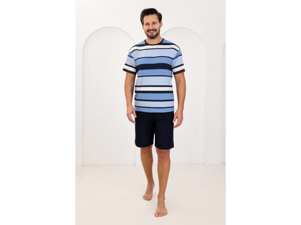 Pánské pyžamo 501 ● vyrobeno z vysoce kvalitní viskózy ● barevné široké pruhované tričko ● klasické krátké rukávy ● kulatý výstřih zdobený kontrastním lemem ● krátké hladké šortky ● pohodlný elastický pas ● baleno v sáčku