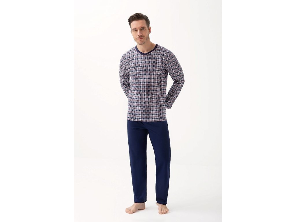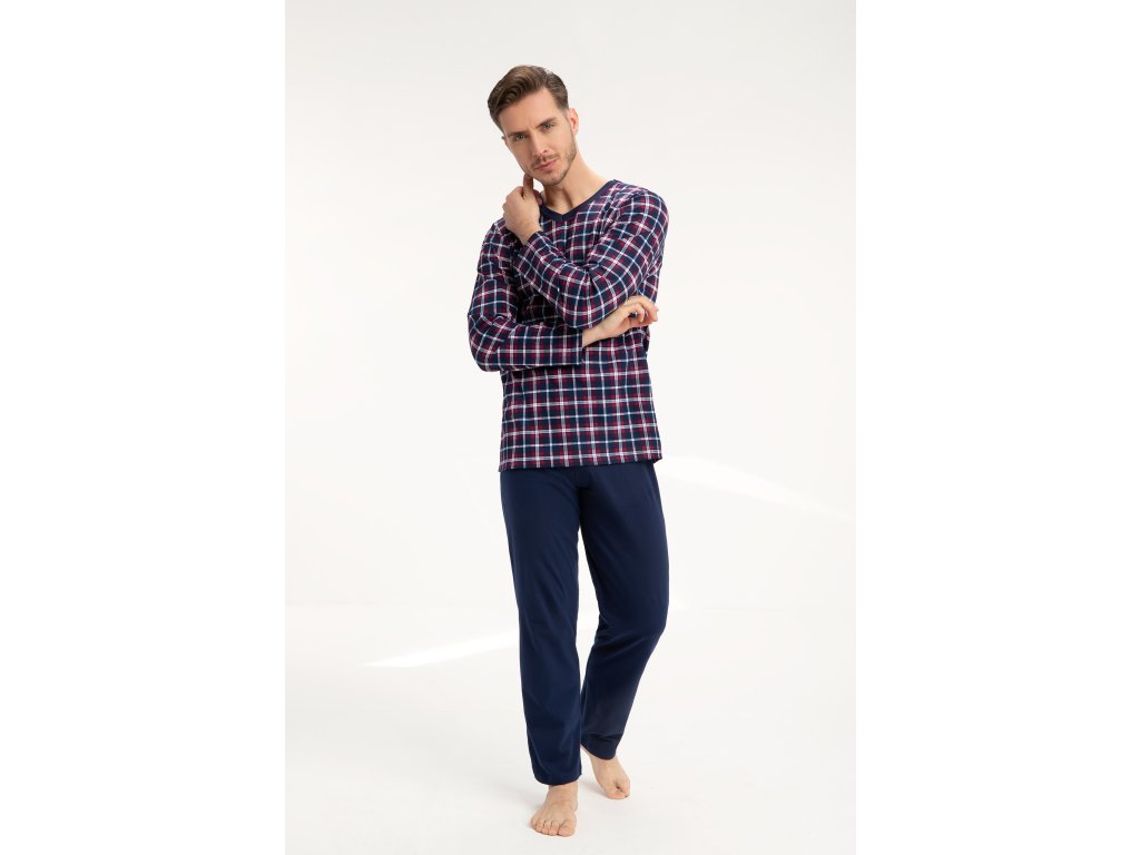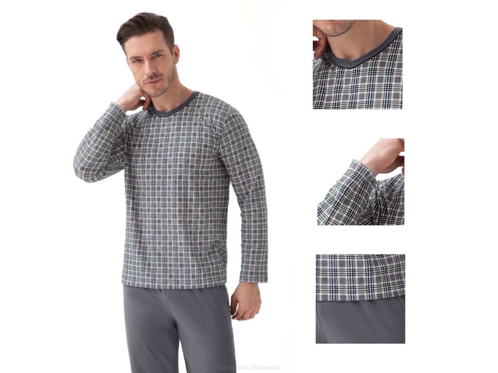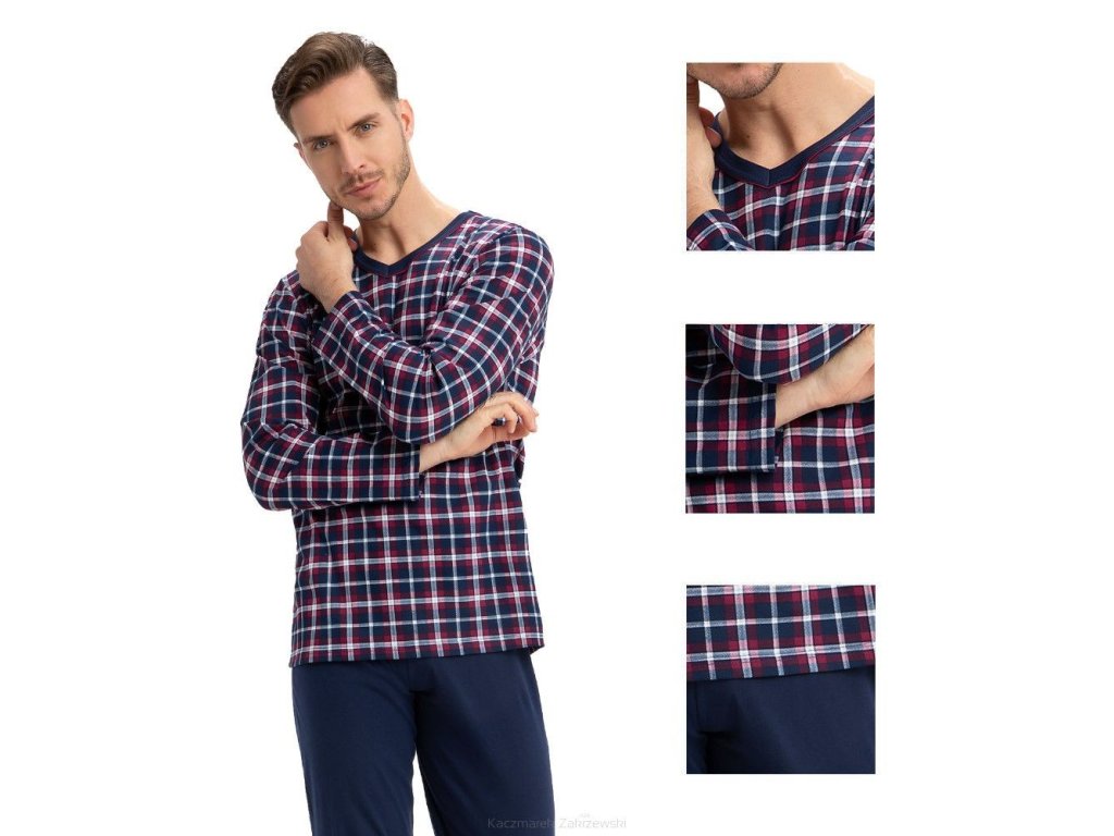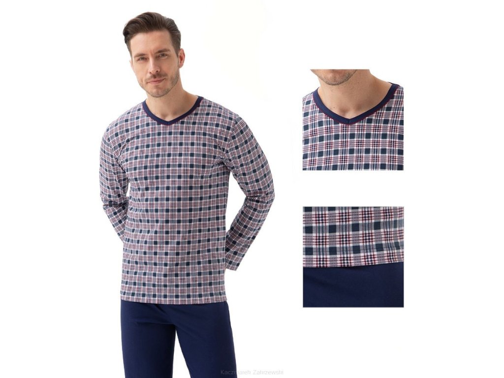 Pánské pyžamo 795 ● z vysoce kvalitní měkké bavlny ● halenka zdobená kostkovaným vzorem ● dlouhé rukávy ● výstřih lemovaný kontrastním lemováním ● dlouhé kalhoty s klasickými rovnými nohavicemi