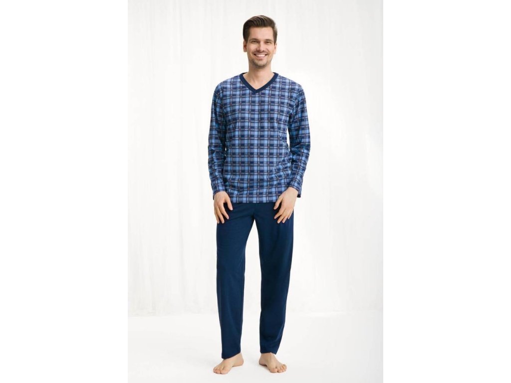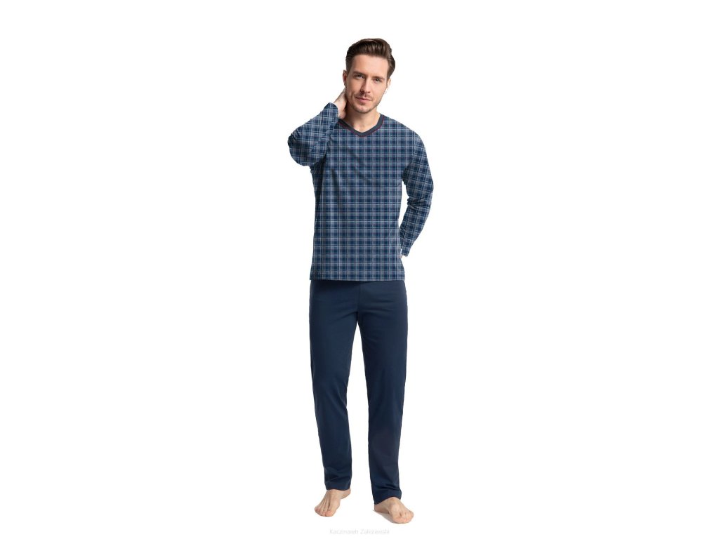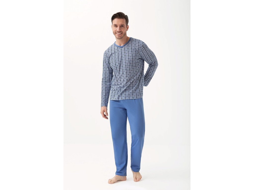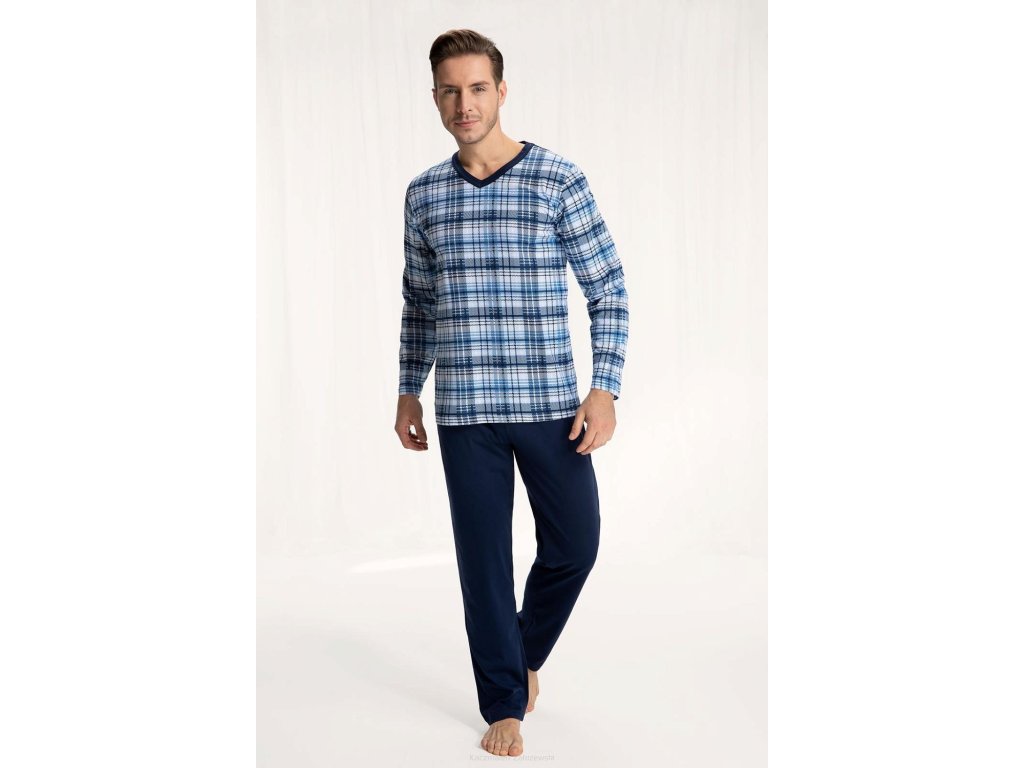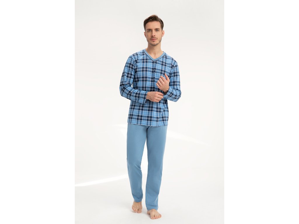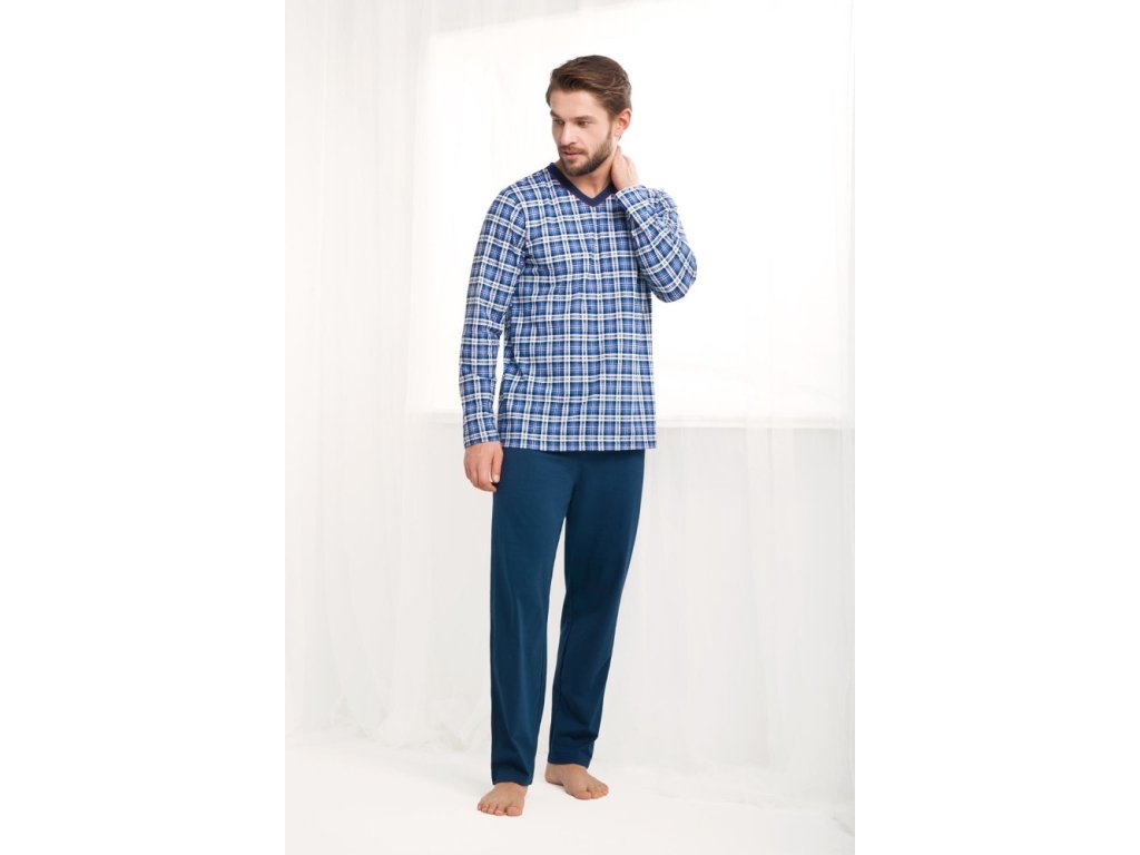 Pánské pyžamo 795 ● z vysoce kvalitní měkké bavlny ● halenka zdobená kostkovaným vzorem ● dlouhé rukávy ● výstřih lemovaný kontrastním lemováním ● dlouhé kalhoty s klasickými rovnými nohavicemi