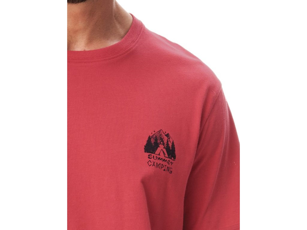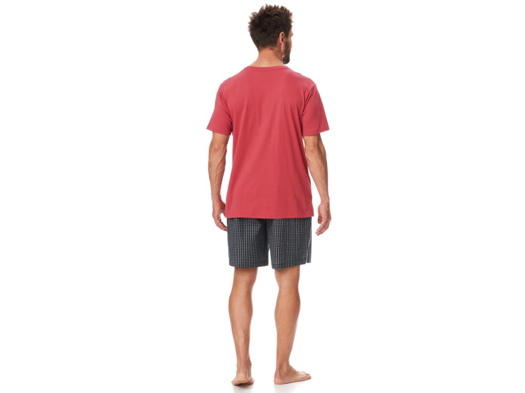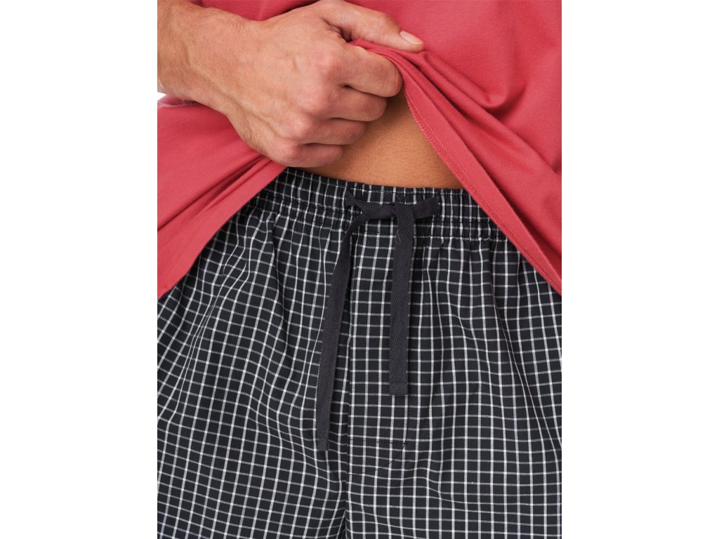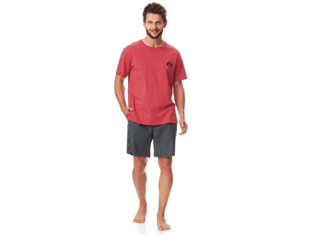 Pánské pyžamo z bavlny. Hladký top zdobený malým motivem na hrudi, s kulatým výstřihem a krátkými rukávy. Doplněno krátkými kostkovanými bavlněnými šortkami s pohodlnými kapsami. V pase pohodlná guma a šňůrka na stažení