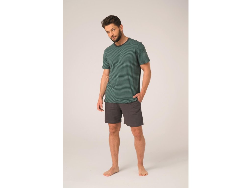 Pánské pyžamo MNS 317 ● vyrobeno ze 100% měkkého, vysoce kvalitního bavlněného úpletu ● grafitově zelená barva ● rovný střih tenké pruhované košile ● kulatý výstřih s lemováním ● klasický krátký rukáv ● boční rozparky ve spodní části blůzy ● krátké hladké šortky s mírně prodlouženou nohavicí ● pohodlný pas, pohodlný elastický pas s bavlněnými šňůrkami pro úpravu střihu ● praktické kapsy na bocích ● volný střih pro naprostou volnost pohybu ● přírodní bavlna umožňuje pokožce dýchat a zajišťuje vysokou úroveň pohodlí