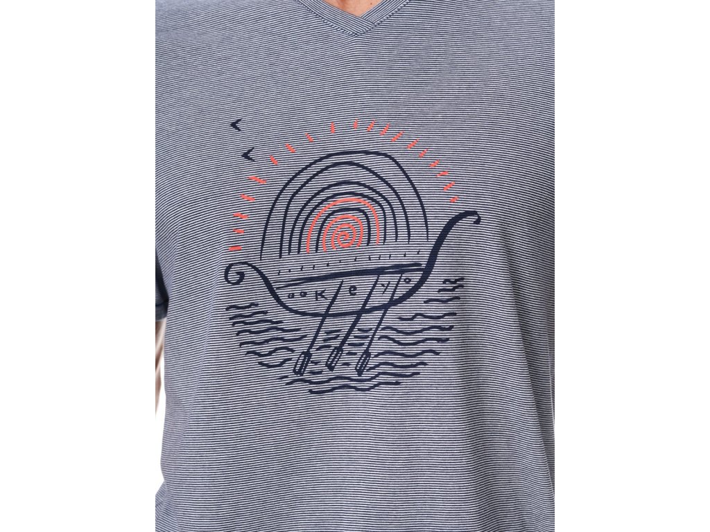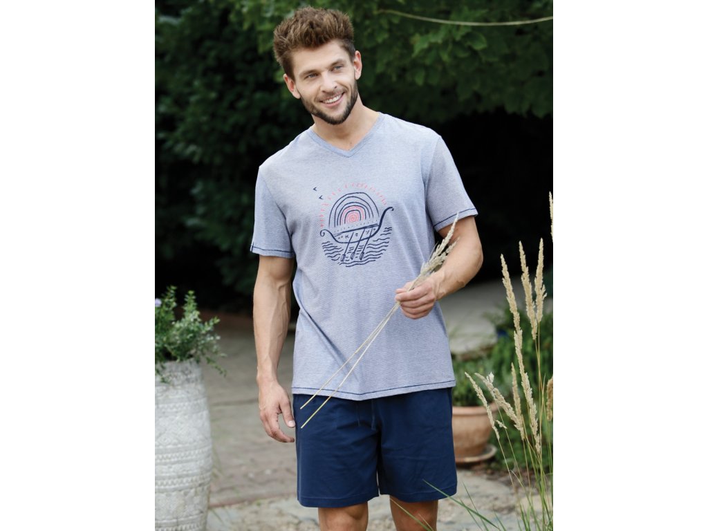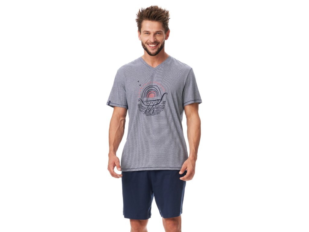 Pánské letní pyžamo z vysoce kvalitní bavlny pro větší pohodlí. Pruhované tričko s krátkým rukávem a výstřihem do V. Přední stranu zdobí prázdninový potisk. Krátké pevné šortky s kapsami a pohodlným elastickým pasem. P