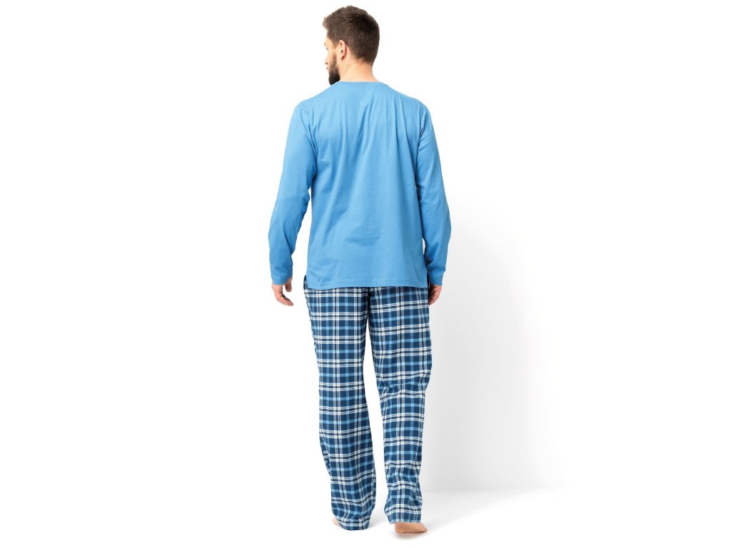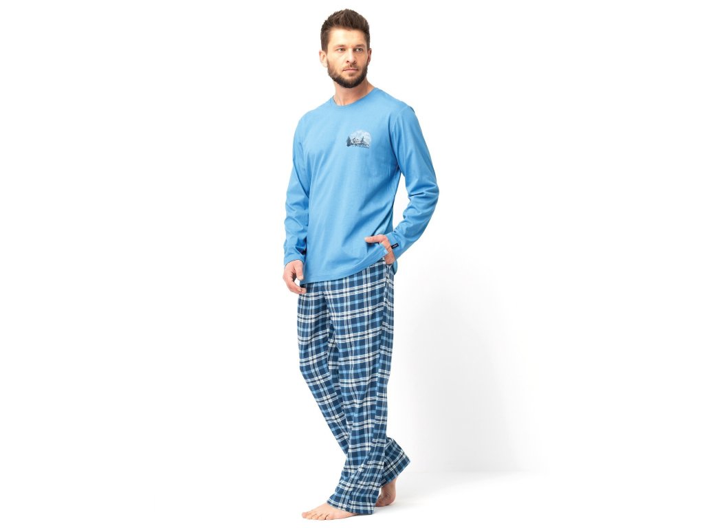 Pánské pyžamo MNS 626 ● souprava s dlouhým rukávem a dlouhými kalhotami ● z měkké a na dotek příjemné bavlny ● půlkulatý výstřih ● vrchní díl v modré barvě s elegantním zimním potiskem na hrudi ● kalhoty z měkkého flanelového úpletu s kostkovaným vzorem ● volný střih pro naprostý komfort a pohodlí při spánku ● praktické dvě boční kapsy ● pohodlný elastický pás lemovaný bavlnou