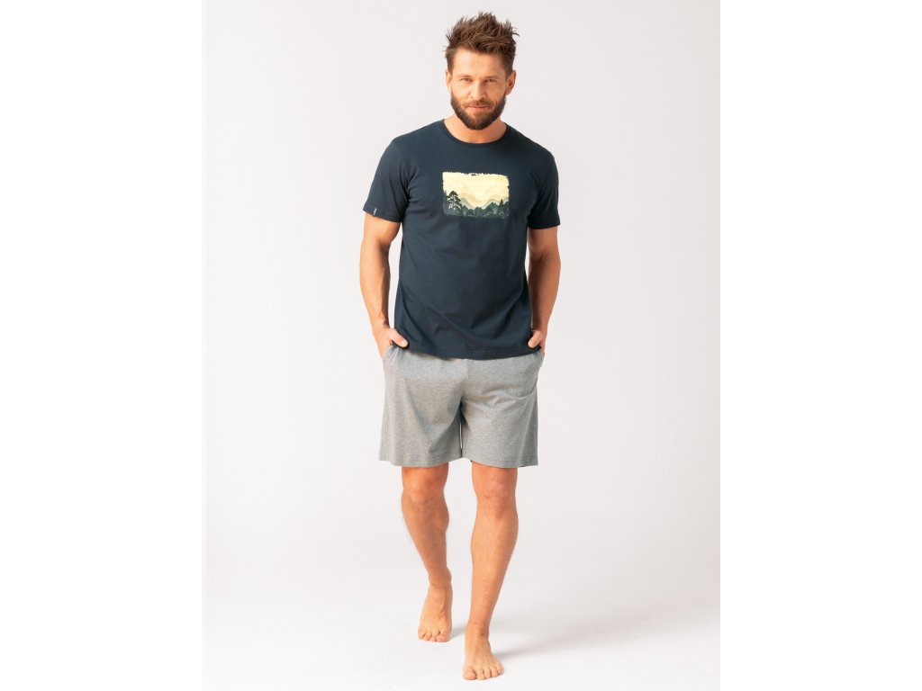 Pánské pyžamo MNS 637 ● sada se skládá z trička s krátkým rukávem a šortek ● barvy: ● vrchní díl - námořnická modř, kalhoty - šedý melír ● klasický střih trička s kulatým výstřihem ● přední díl s ozdobnou grafikou horské krajiny ● krátké šortky, prodloužená nohavice ● pohodlný, měkký elastický pas a bavlněné pásky na nastavení ● praktické kapsy na bocích ● volný střih zaručuje plnou volnost pohybu ● vyrobeno z vysoce kvalitní bavlny, příjemné na dotek a prodyšné