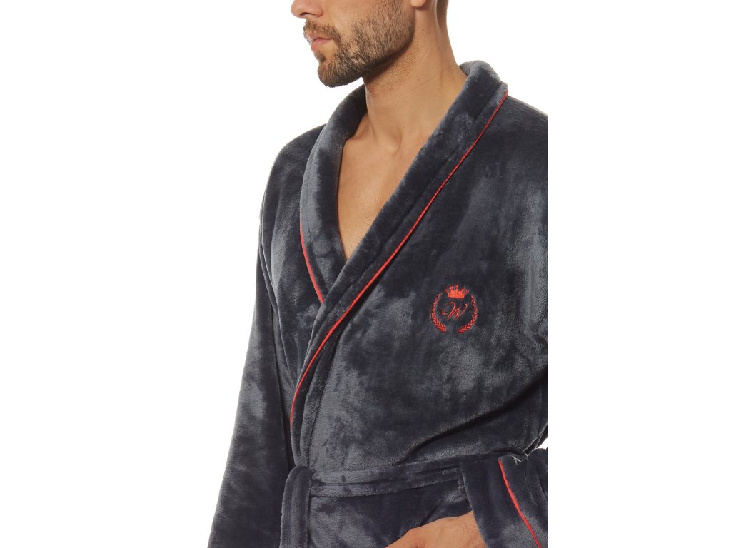Klasický pánský župan s šálovým límcem z měkkého úpletu. Zakončený lemováním v kontrastní barvě. Ozdobná výšivka na úrovni hrudníku. Zavazování v pase. Pohodlné kapsy na bocích