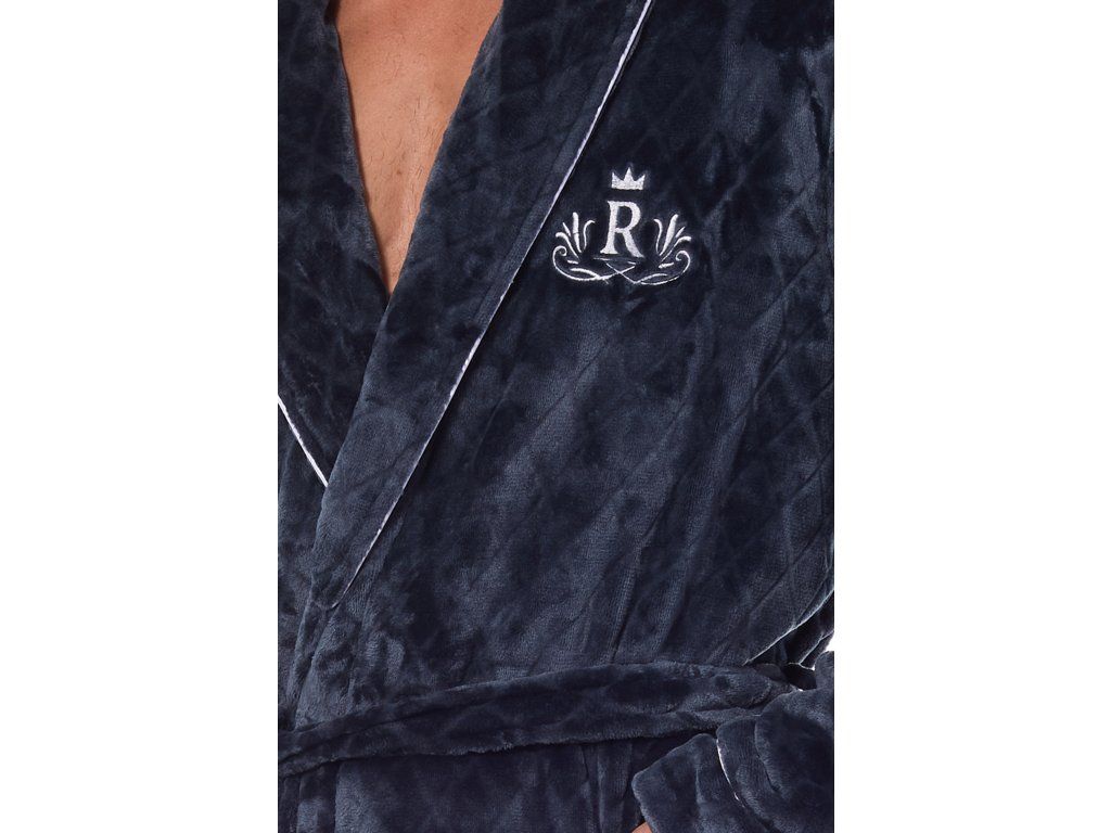 Pánský župan 2453 Ready ● klasický střih, délka ke kolenům ● z úpletu příjemného na dotek ● zavazování v pase, pohodlné kapsy na bocích ● šálový límec lemovaný kontrastní barevnou lemovkou stejně jako manžety ● ozdobná výšivka na hrudi ● úplet s kosočtvercovým reliéfem