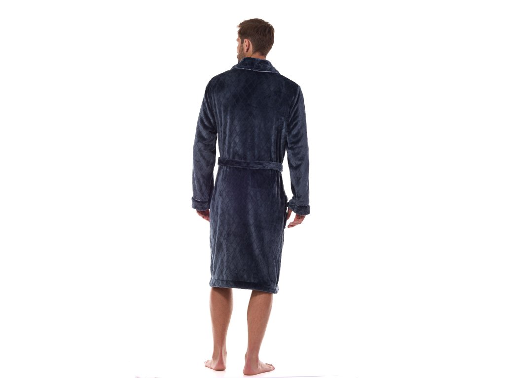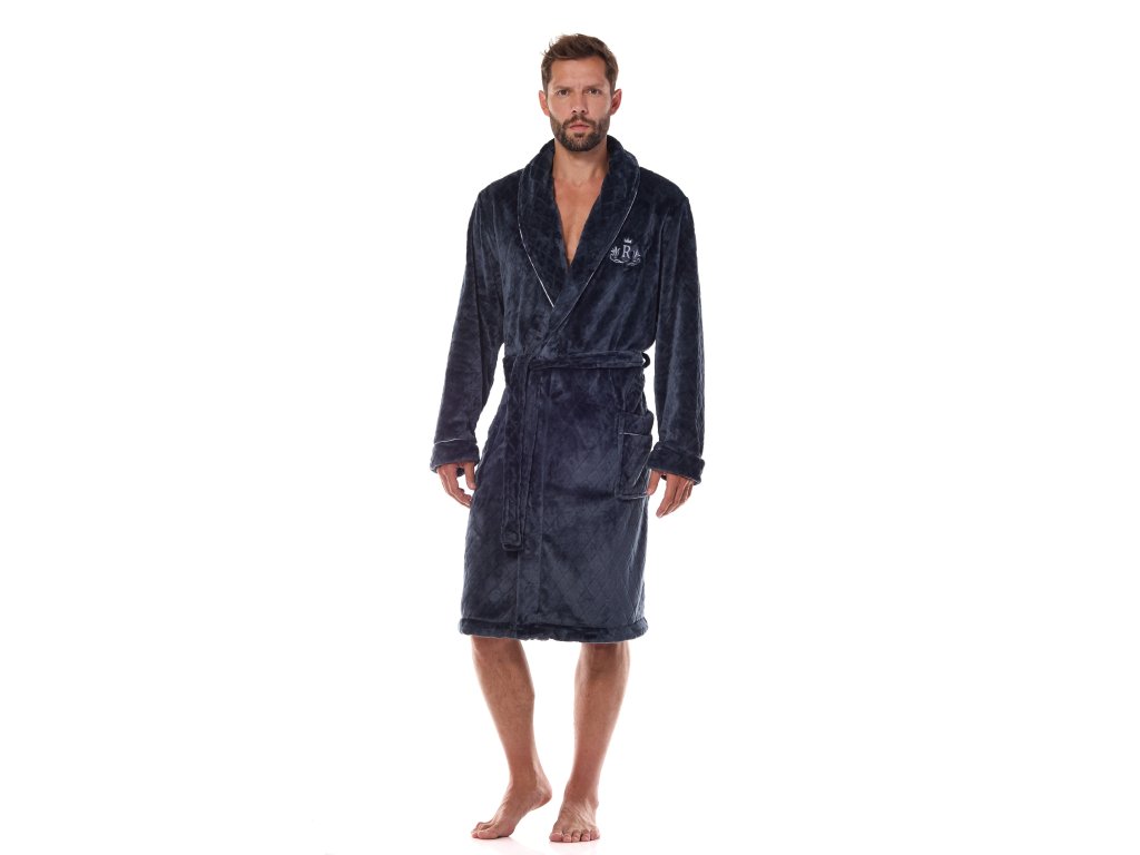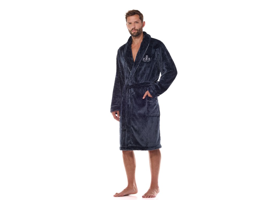Pánský župan 2453 Ready ● klasický střih, délka ke kolenům ● z úpletu příjemného na dotek ● zavazování v pase, pohodlné kapsy na bocích ● šálový límec lemovaný kontrastní barevnou lemovkou stejně jako manžety ● ozdobná výšivka na hrudi ● úplet s kosočtvercovým reliéfem