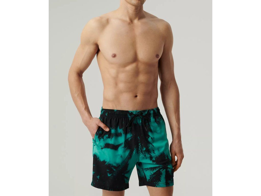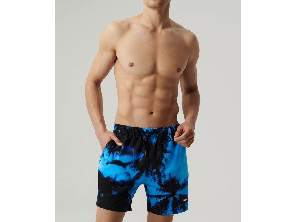 Plavecké šortky KMB-227 ● potisk prázdninových palem ● horní část se středním sedem ● pevný strečový materiál ● univerzální délka nohavic ● praktické boční kapsy ● kapsa na suchý zip na zadní straně ● stahovací pásek ● síťovaná vnitřní strana v podobě slipů ● rychleschnoucí materiál odolný proti slunci