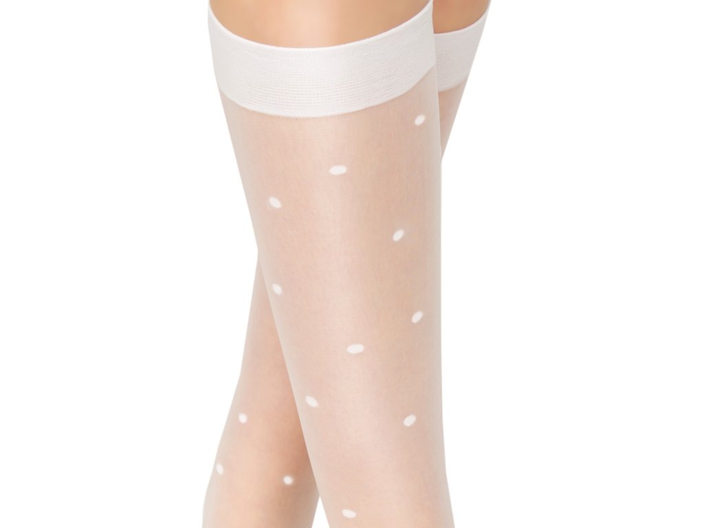 Kropki Kkolanówki Kropki 20 Den SM002 ● jemné, bílé s tečkami ● z elastické příze ● tloušťka 20 Den ● zakončené netlačícím lemem ● balené po 2 párech, prodej celého balení