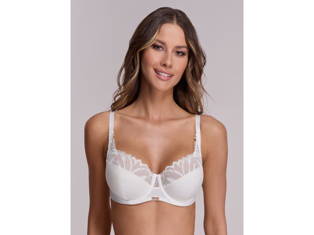 AV 2105 Maxi podprsenka ● polovyztužené košíčky vycházející z nejprodávanějšího designu K1030 ● na spodních částech vyztužená měkkou pěnou ● z vnější strany potažená elastickým úpletem ● horní část košíčků z hustě tkané květinové krajky ● krajka hladce přiléhá k tvaru prsou a postupně stoupá na ramínka ● můstek a zadní část jsou zvýrazněny kovovou destičkou s logem ● bez bočních kostic ● ramínka neodnímatelná, šířka podle velikosti ● nastavitelná ramínka - kovový, antialergický regulátor ● dvojité/trojité zapínání na háčky a očka