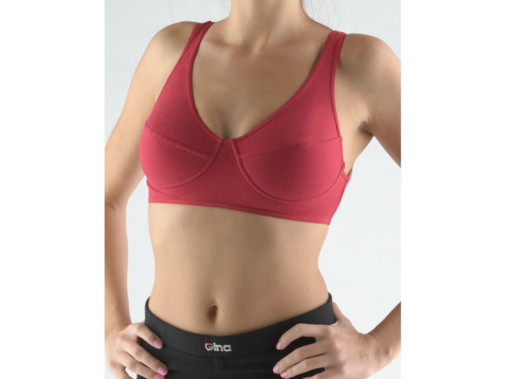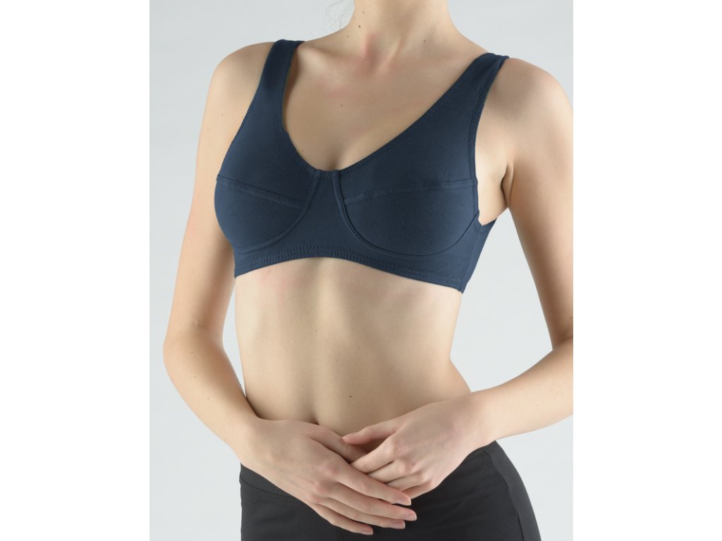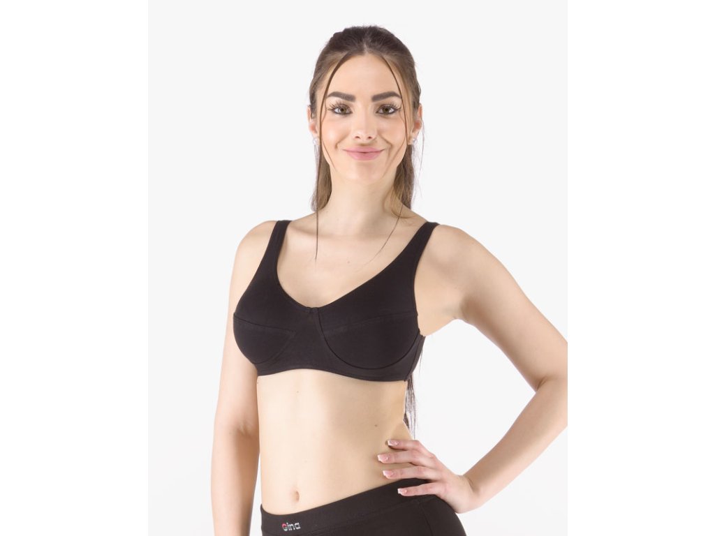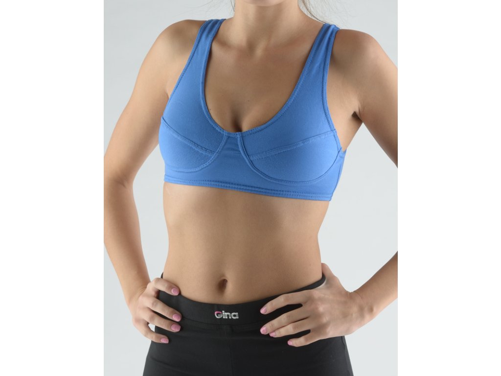 Podprsenka se širšími ramínky přes hlavu, dámské sportovní prádlo. V dolním kraji je zašitá úzká pruženka. V průramcích a průkrčníku je zašitá úzká pruženka. Podprsenka je jednobarevná.