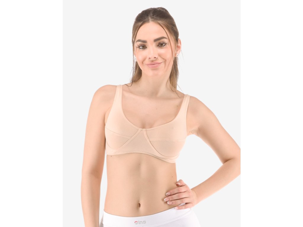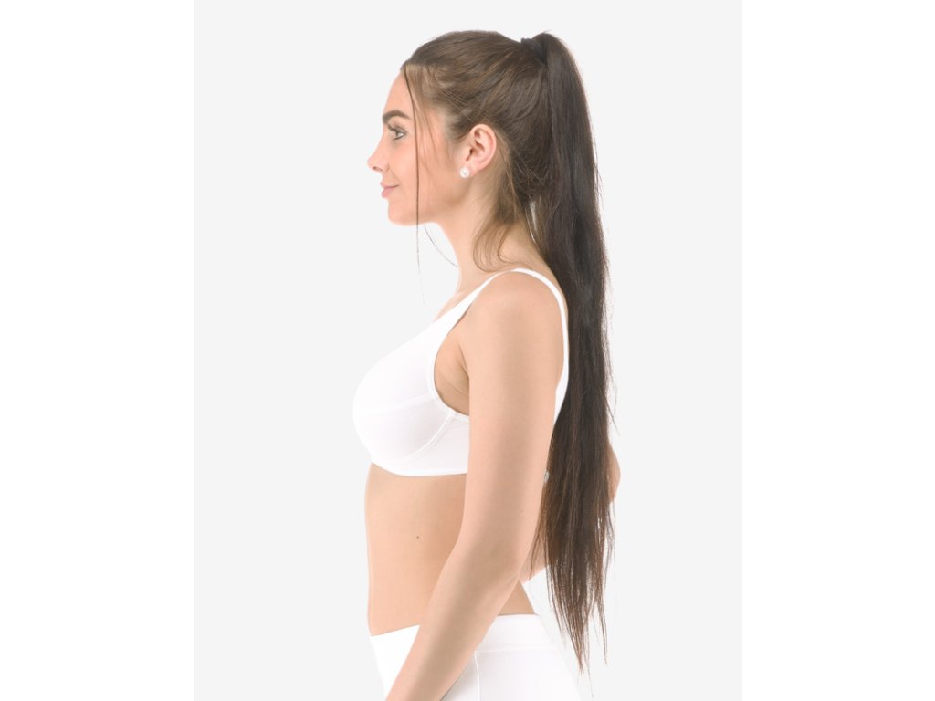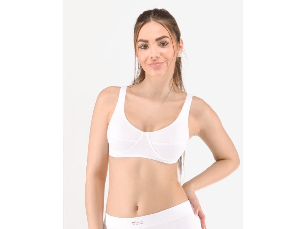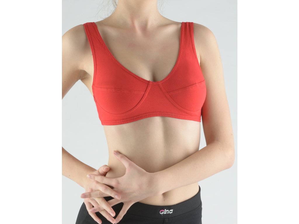 Podprsenka se širšími ramínky přes hlavu, dámské sportovní prádlo. V dolním kraji je zašitá úzká pruženka. V průramcích a průkrčníku je zašitá úzká pruženka. Podprsenka je jednobarevná.