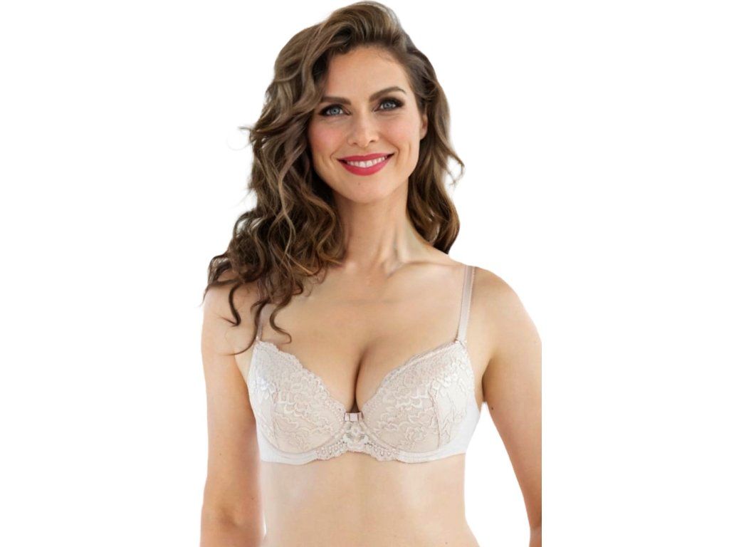 Push-up podprsenka s kosticemi a vyztuženými košíčky Vyjímatelné vycpávky košíčků Nastavitelná ramínka Elastická krajka po celém obvodu košíčků Elastický materiál po stranách podprsenky