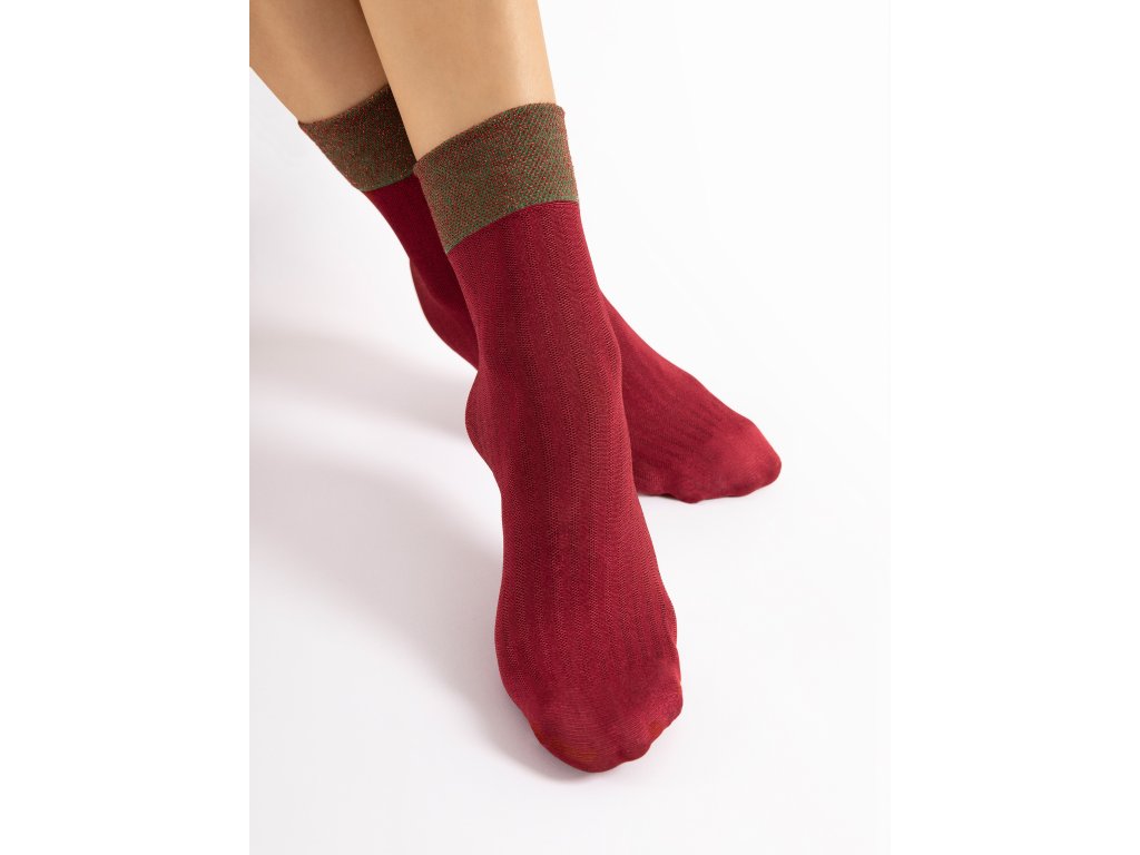 Nápadné ponožky, v nichž se elegance snoubí s luxusem. Tyto nádherné ponožky jsou zdobené měděným lemem z lurexové příze, který vytváří bohatý akcent, který přímo vyzařuje styl a třpytí se, zachycuje světlo při každém pohybu. Dodejte svému vzhledu šmrnc! Tyto ponožky jsou navrženy tak, aby vynikly, ať už se chystáte na výjimečnou událost, večer do města, nebo jen chcete svému každodennímu outfitu dodat nádech rafinovanosti. Zkombinujte je s podpatky, elegantními botami nebo dokonce kozačkami a vytvořte styl, který vyzařuje sebevědomí a šarm. Nechte tyto ponožky dokázat váš dokonalý vkus a touhu užívat si těch nejlepších věcí v životě
