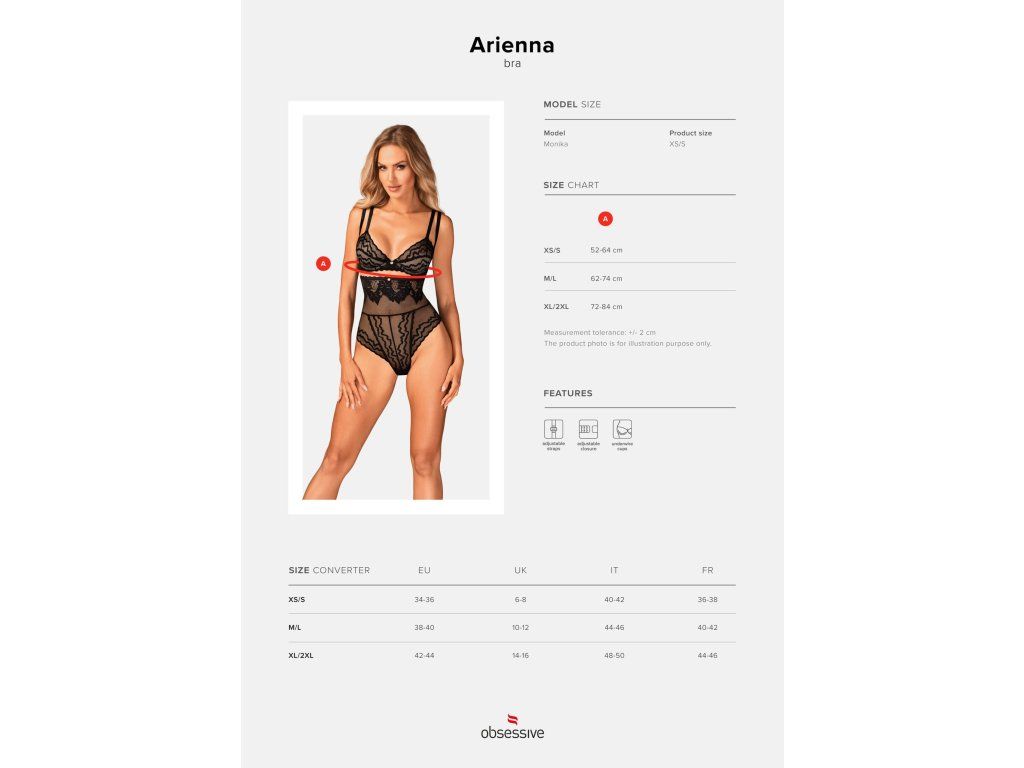 Elegantní černá podprsenka Arienna. Jemně průhledný, na dotek příjemný materiál - svůdný a zajímavý. Vyztužené kostice - vynikající podpora poprsí. Nastavitelná dvojitá ramínka podprsenky - moderní komfort při nošení. Pohodlné zapínání na zádech - nastavitelné. Bižuterní přívěsek mezi prsy - dodává šarm