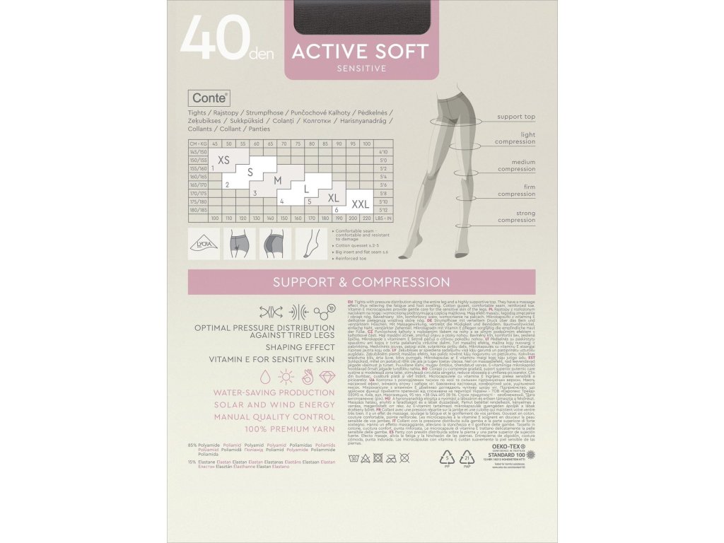 ● tvarují - zeštíhlují a korigují linii boků, pasu a břicha ● s rovnoměrně rozloženou kompresí po celé délce nohy ● stimulují krevní oběh ● snižují únavu a otoky nohou ● mají protiúnavový účinek ● ideální pro citlivou pokožku ● s mikrokapslemi vitaminu E, s mikrokapslemi vitaminu E, které vyživují pokožku a zásobují buňky kyslíkem ● se zesílenou oblastí prstů a bavlněným klínem ● s plochými švy, které zajišťují pohodlí a odolnost ● střih rámuje a zeštíhluje nohy