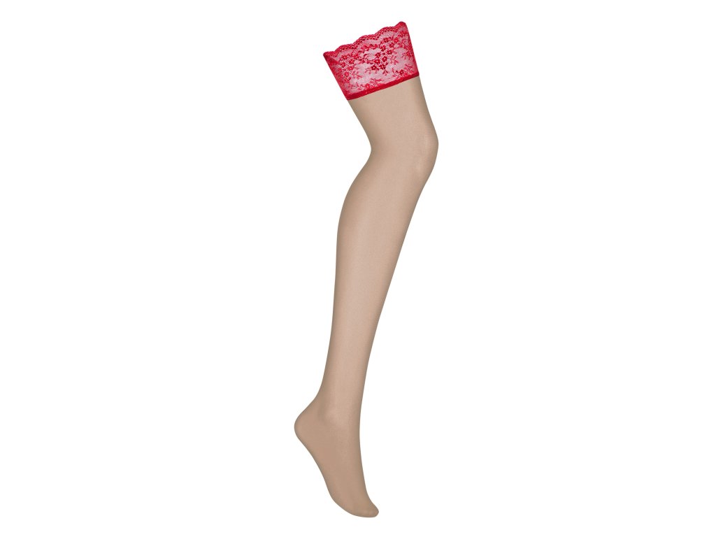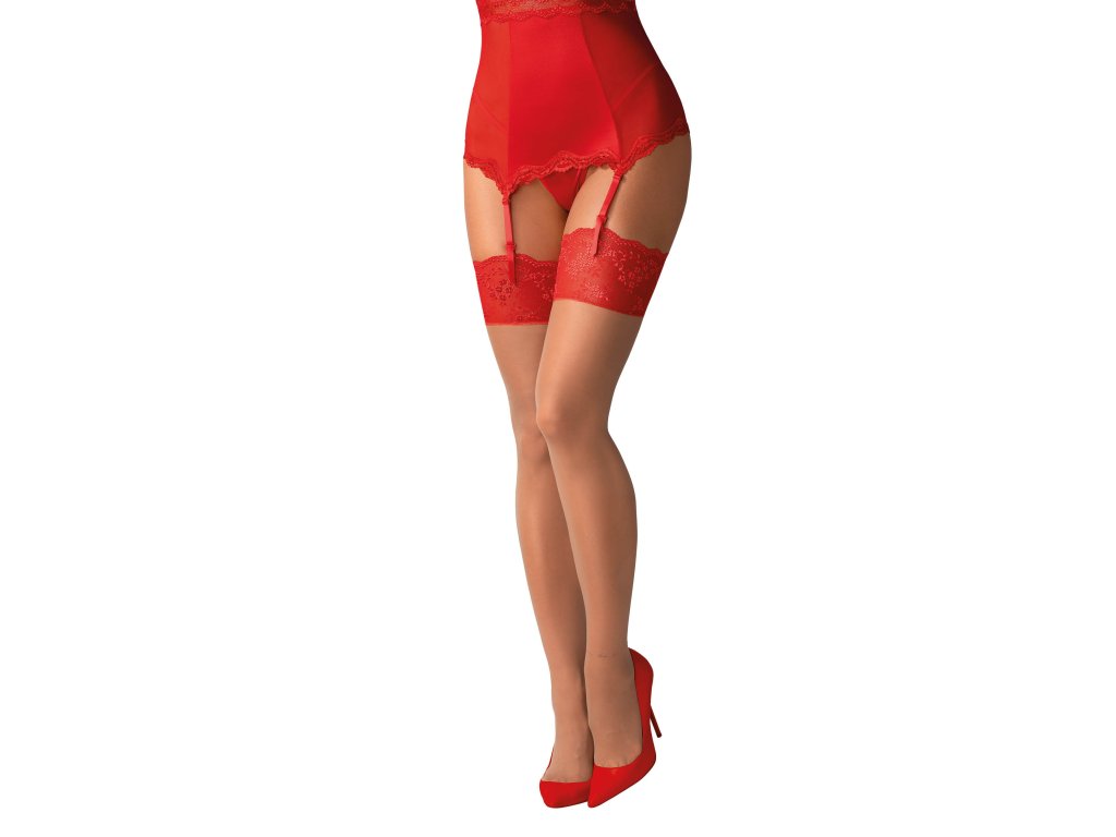 Punčochy Lovica ● dokonale ladí s celou kolekcí ● červená krajka s třpytivým květinovým vzorem svůdně zdobí stehna ● síťovina v tělové barvě sexy odhaluje nohy