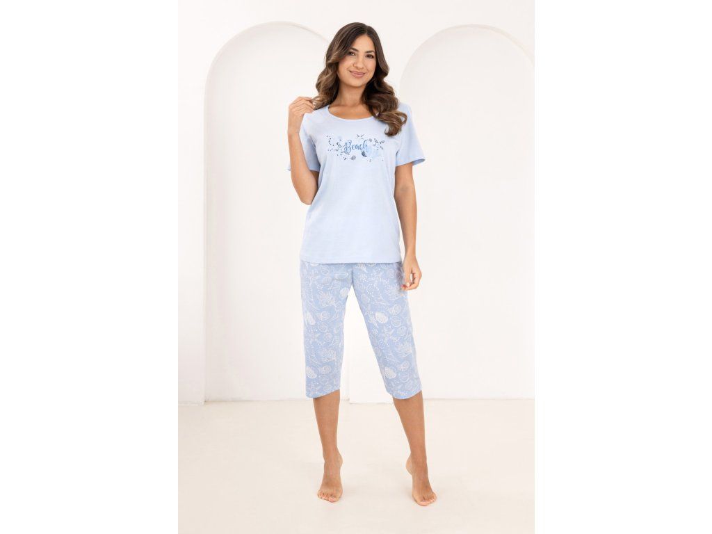 Dámské pyžamo 737 ● vyrobeno z vysoce kvalitní, měkké a prodyšné bavlny ● tričko s krátkým rukávem, ideální pro teplejší dny a noci ● přední část trička zdobí jemný potisk s motivem moře ● půlkulatý výstřih pro větší pohodlí ● 7/8 dlouhé kalhoty, látka je měkká na dotek a jemná k pokožce ● ideální na spaní i domácí odpočinek ● dodává se zabalené v atraktivním sáčku