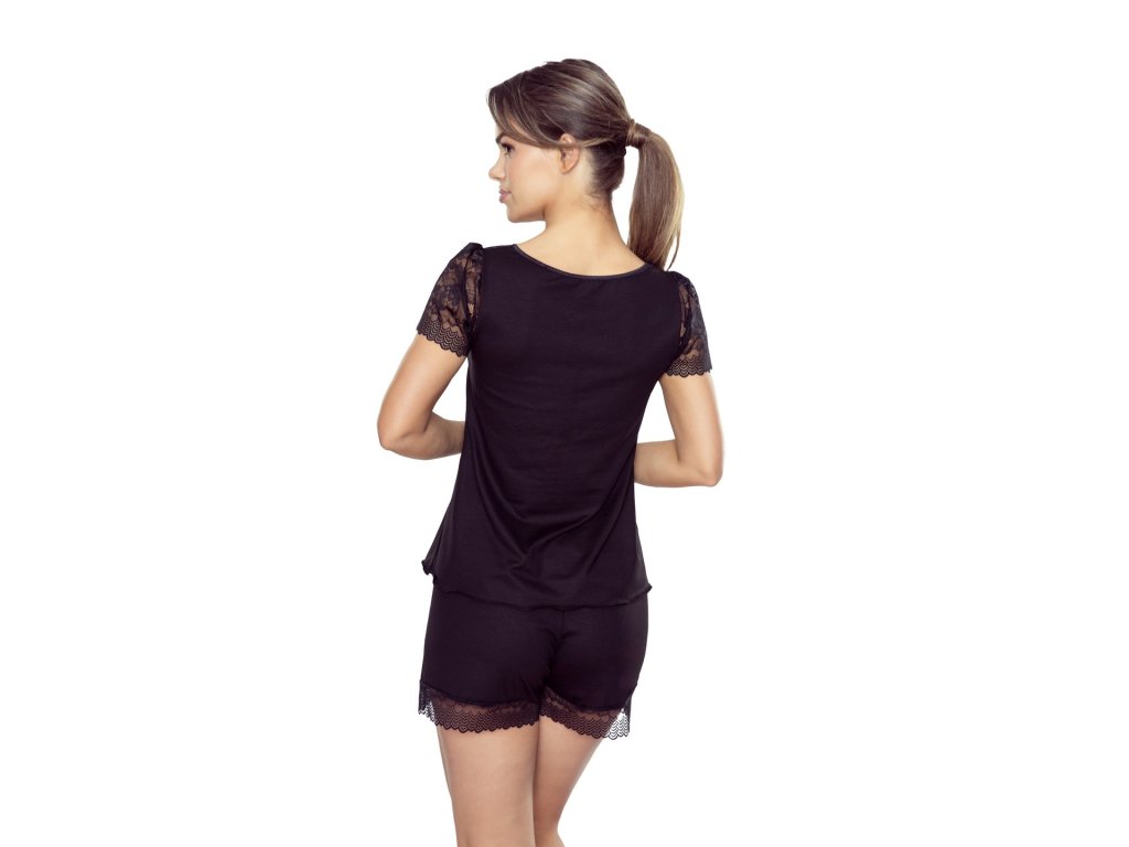 Pyžamo Beverly Plus ● vrchní díl s krátkými rukávy ● zdobený jemnou krajkou na výstřihu, rukávech a pod poprsím ● elastický pásek pod poprsím jemně zvýrazňuje siluetu ● volný střih pro pohodlí a volnost pohybu ● šortky, vyrobené z měkkého materiálu, mají v pase elastický pásek ● krajkový lem na nohavicích dodává eleganci a lehkost.