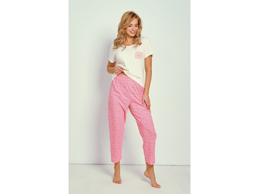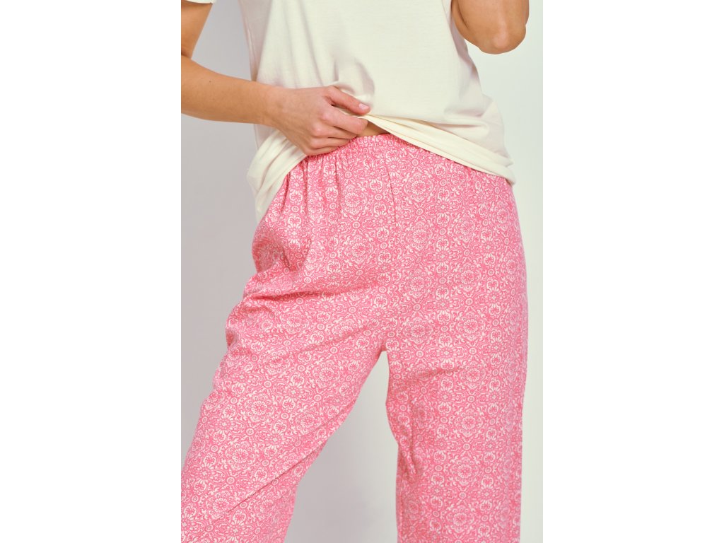 Pyžamo Corni 3336 KR ● z měkké bavlny ● tričko v barvě ecru s krátkými rukávy ● půlkruhový výstřih ● jemný lidový potisk v oblasti hrudníku ● růžové vzorované kalhoty do soupravy ● délka nohavic 7/8, volný střih ● pohodlná guma v pase
