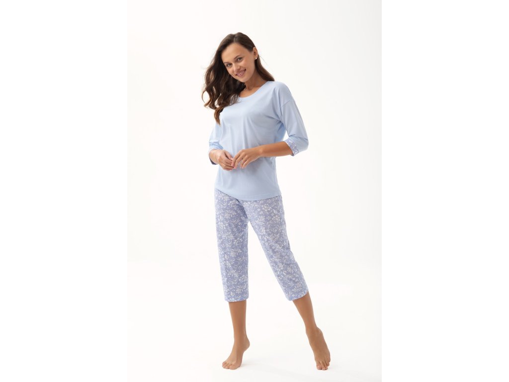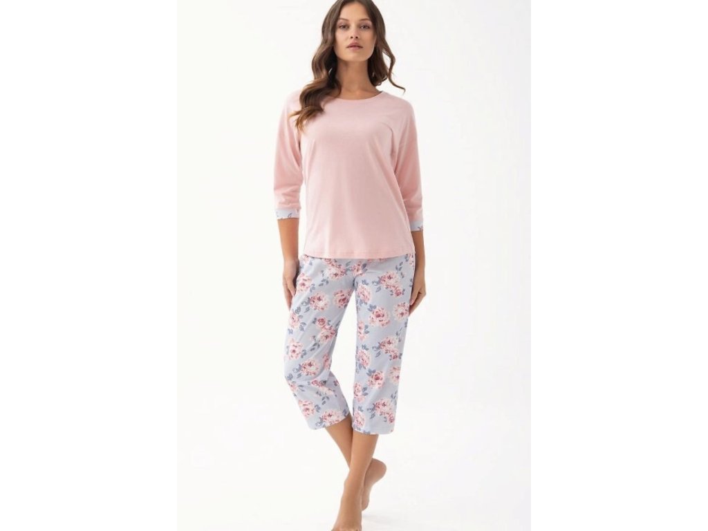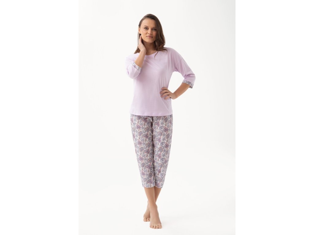 Dámské bavlněné pyžamové tričko s 3/4 rukávem, kulatý výstřih, rukávy lemované vzorovaným materiálem,
