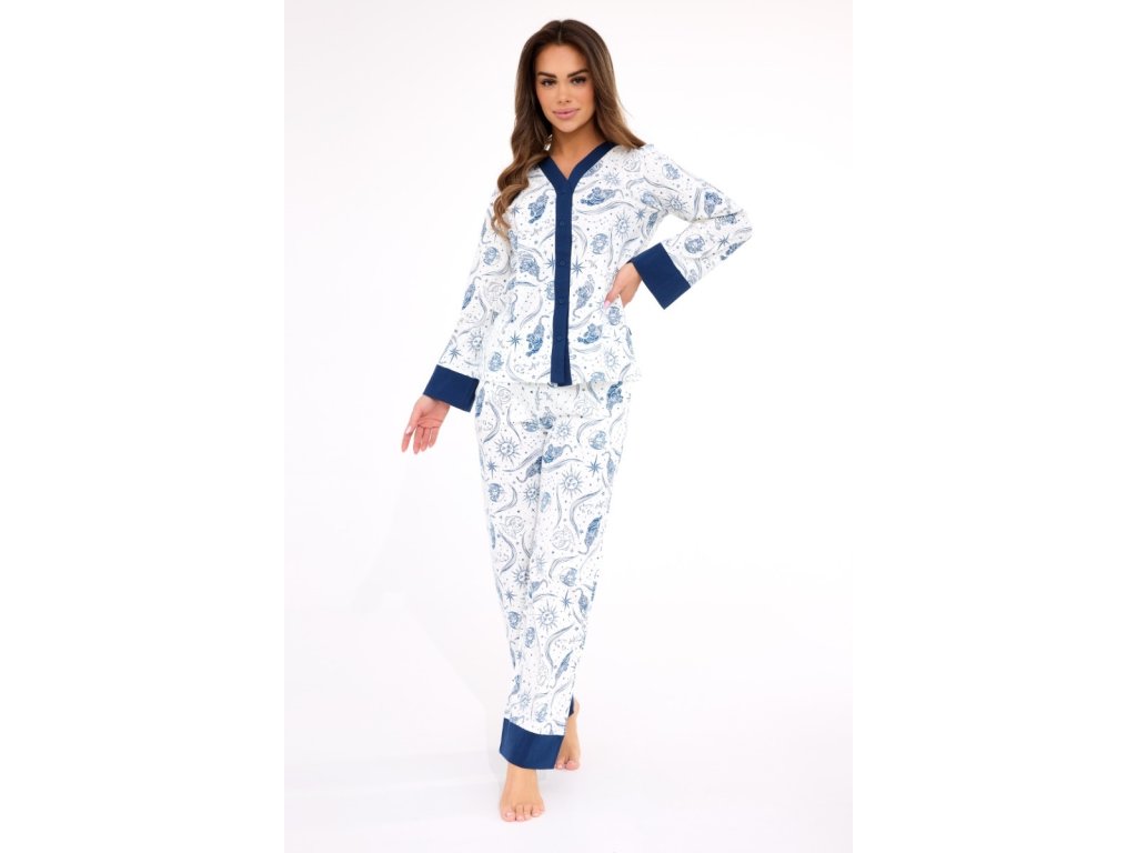 Dámské bavlněné dlouhé propínací pyžamo značky Cornette v bílé a modré barvě.
