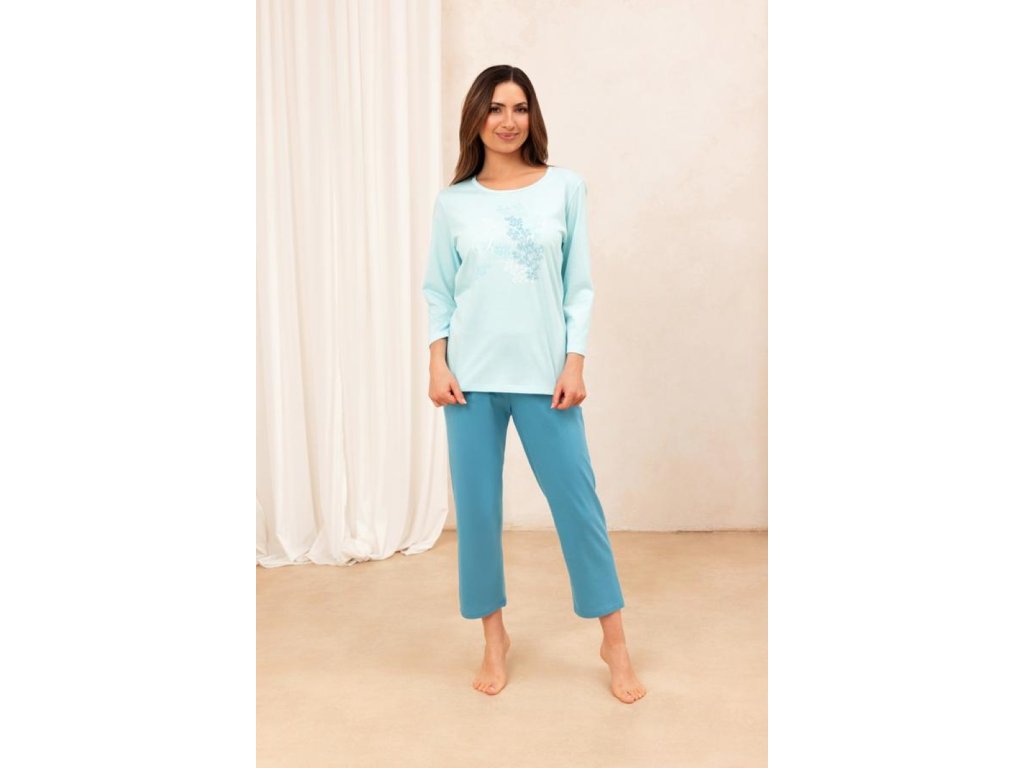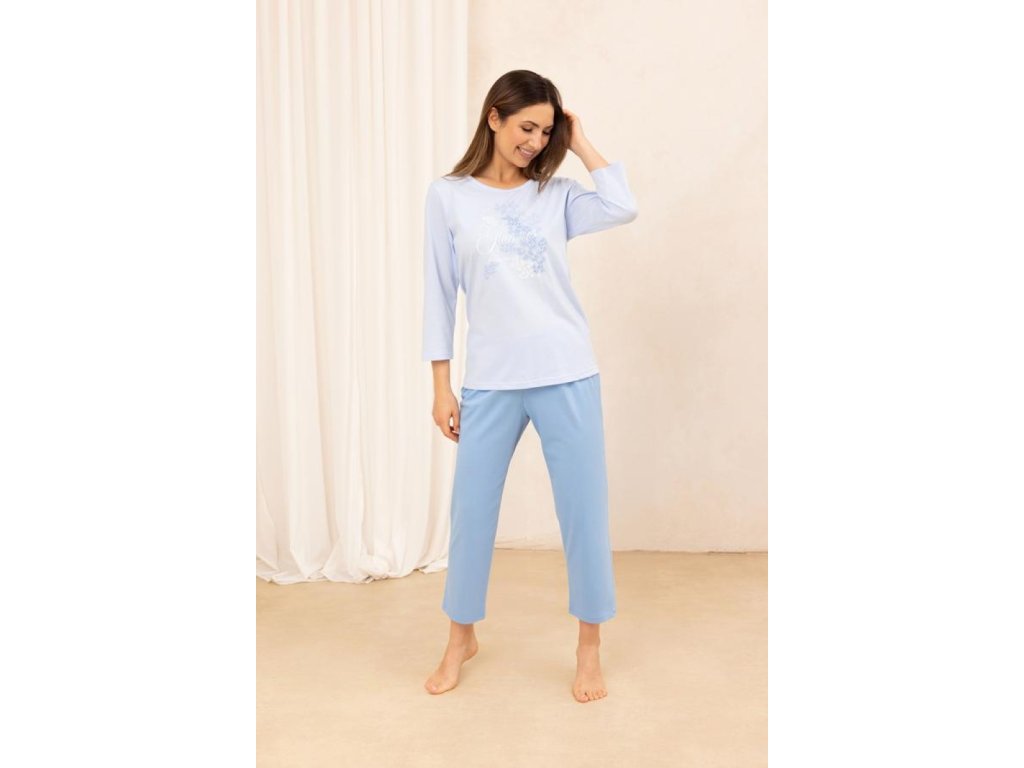 Bavlněné pyžamo Dámské tričko 3/4 rukáv Crew Dekorativní potisk Pevné kalhoty Délka 7/8