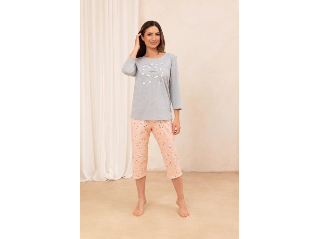 Dámské bavlněné pyžamo, pevné tričko, 3/4 rukáv, přední díl s jemným květinovým potiskem,