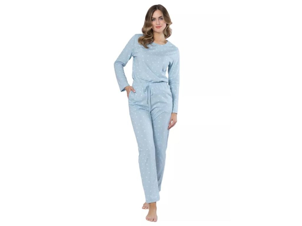 Dámské pyžamo Marta 1646 přináší dokonalou rovnováhu mezi elegancí a pohodlím. Jemný světle modrý odstín s decentním vzorem dodává celému setu svěží, uvolněný vzhled, který oceníte při každém večerním odpočinku. Vrchní díl s dlouhými rukávy a kulatým výstřihem poskytuje příjemné zakrytí i volnost pohybu díky pohodlnému střihu. Spodní kalhoty jsou navrženy s elastickým pasem a šňůrkou pro individuální nastavení komfortu – ideální pro klidné noci i lenošení během dne.