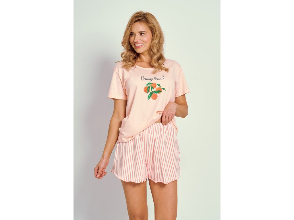 Pyžamo Darcie 3322 KR ● z vysoce kvalitní bavlny ● tričko s krátkým rukávem ● zdobené oranžovým potiskem ● půlkulatý výstřih ● pruhované šortky pro kompletní sadu ● nohavice zakončené volánkem (síťovina) ● volný střih pro větší pohodlí ● pohodlný elastický pas
