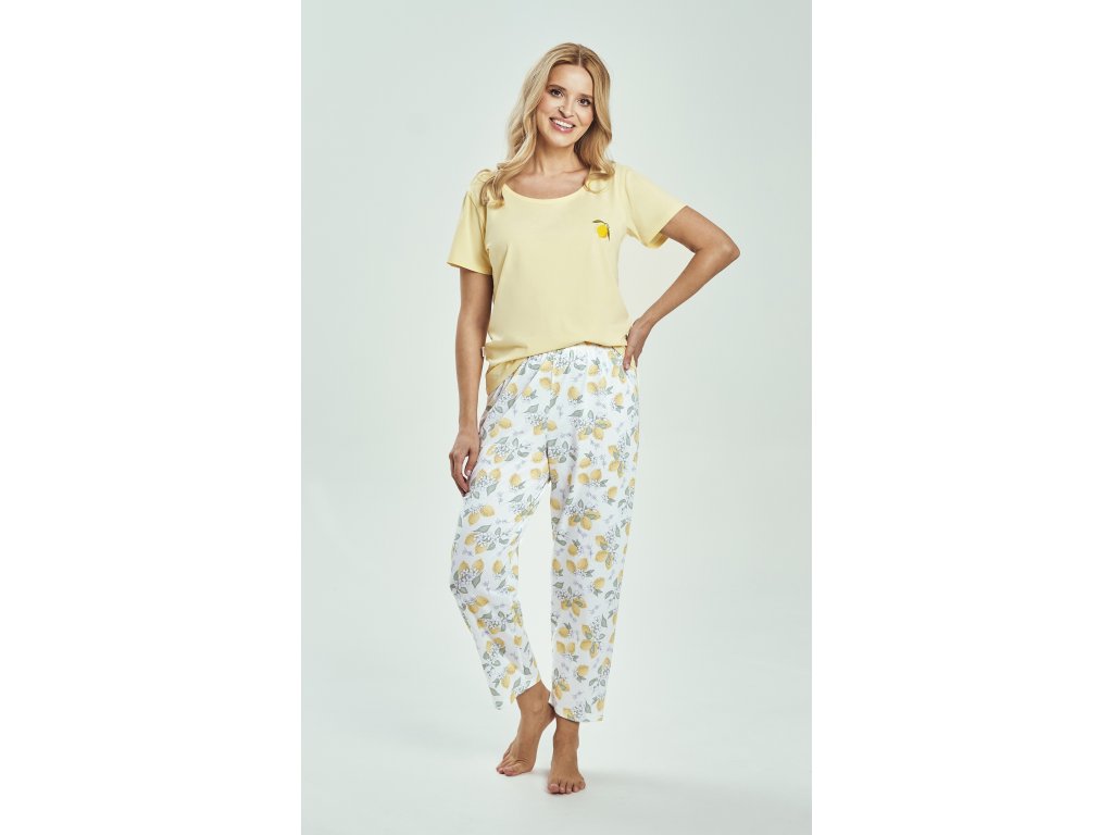 Pyžamo Frida 3532 ● z měkké a na dotek příjemné bavlny ● tričko s krátkým rukávem ● půlkulatý výstřih pro pohodlné nošení ● zdobené jemným potiskem citronů na úrovni hrudníku ● kalhoty v délce 7/8 zdobené jemným potiskem citronů, květin a listů ● elastický pás lemovaný bavlnou ● baleno v plastovém sáčku ● ideální pro spánek a domácí relaxaci
