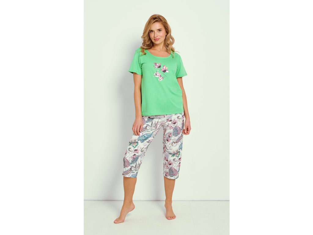 Pyžamo Lia 3344 ● vyrobeno z vysoce kvalitní bavlny ● pevná košilka s krátkými klasickými rukávy ● půlkruhový výstřih ● vpředu zdobená květinovou aplikací ● světlé kalhoty s květinovým motivem ● 3/4 délky nohavic ● volný střih pro větší pohodlí ● pohodlný elastický pas