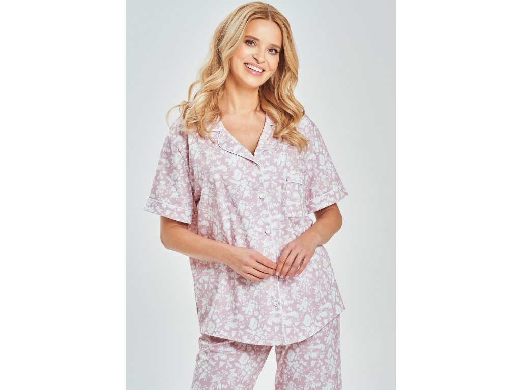 Pyžamo Lora 3544 ● z měkké a na dotek příjemné bavlny ● zdobené květinovým vzorem ● tričko s krátkým rukávem a límečkem ● zapínání na knoflíky ● našitá náprsní kapsa ● výstřih do V ● volné dlouhé kalhoty ● elastický pas lemovaný bavlnou ● baleno v plastovém sáčku ● ideální pro spánek a domácí relaxaci