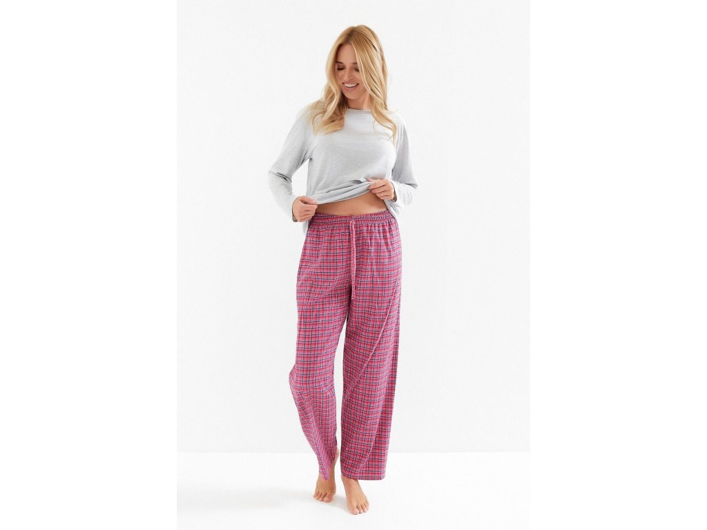 Pyžamo Madlen 3512 ● z měkké, prodyšné bavlny ● halenka s dlouhými rukávy a půlkruhovým výstřihem pro dokonalé pohodlí ● jemný ženský potisk na hrudi pro větší lehkost ● dlouhé kalhoty v klasickém kostkovaném vzoru - ideální pro chladnější noci ● elastický pas s pohodlnou gumou a ozdobnou šňůrkou