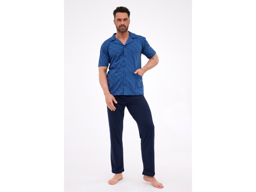 Pánské pyžamo, vysoce kvalitní bavlna, zapínání na knoflíky, kostkovaná mikina, krátké rukávy, límeček, kapsy, dlouhé nohavice, jednobarevné.