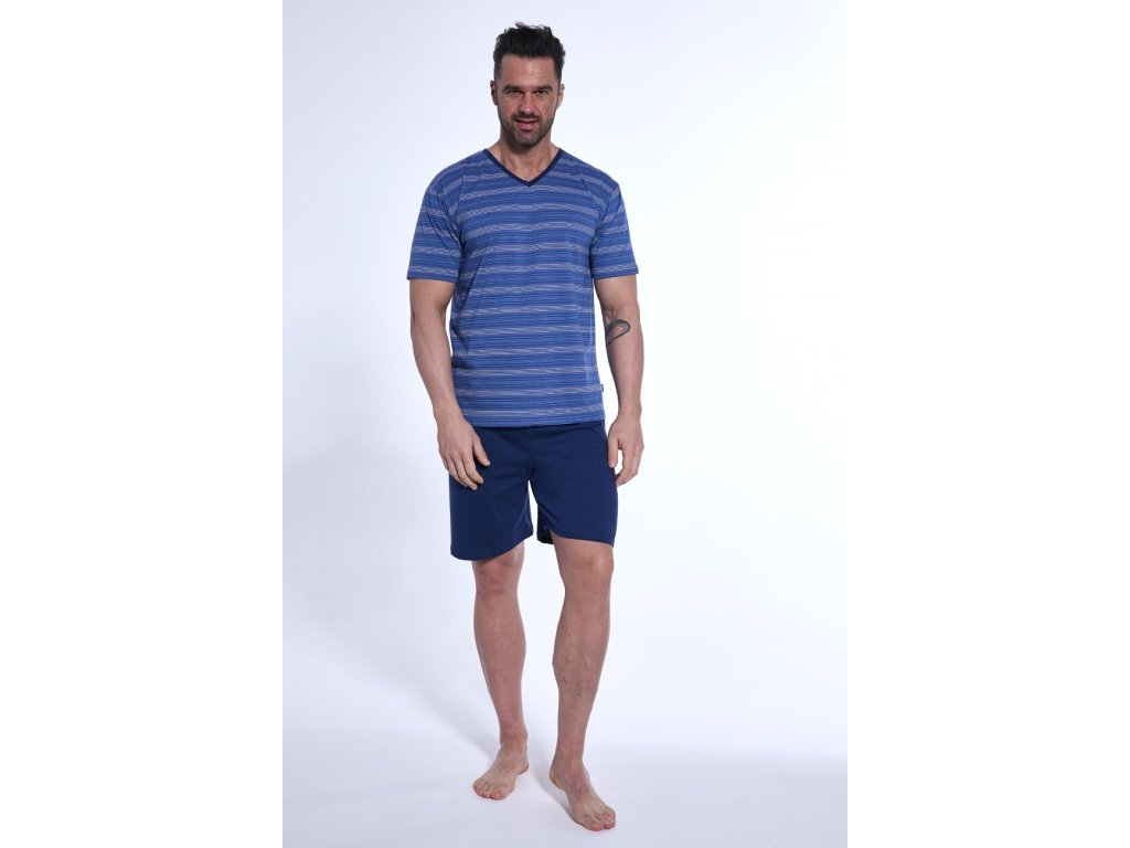 Pánské pyžamo vyrobené z vysoce kvalitní bavlny. Pruhované tričko s krátkým rukávem, výstřih do V.