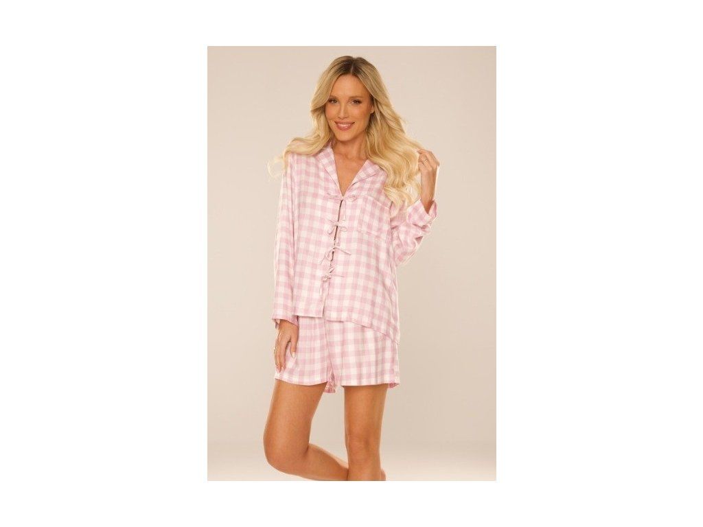 Primrose 825 pyžamo ● dvoudílná souprava na nošení po domě i na spaní ● z vysoce kvalitní viskózy s kostkovaným vzorem ● vrchní díl s ozdobnými vázačkami ● zakončený límcem ● délka rukávu 7/8 ● našitá kapsa na hrudi ● krátké kalhoty volného střihu