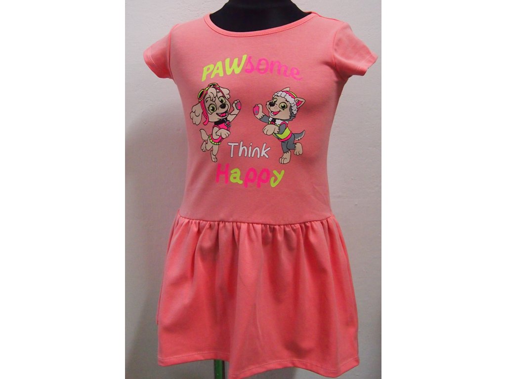 Krásné, vzdušné dívčí šaty z jemné bavlny. Šaty s krátkými rukávy a půlkulatým výstřihem. Spodní část nařasená. Přední díl zdobí barevný potisk pejska.