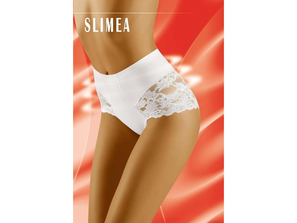 Spodní díl bikin Slimea ● plný střih ● vyrobený z vysoce kvalitního úpletu pro korekci postavy ● pevně zplošťuje břicho a koriguje linii pasu ● použití originální krajky přecházející na záda ● dokonale zvýrazňuje hýždě a zdobí tělo ● zeštíhlující prádlo kombinující funkci korekce s rafinovaným vzhledem