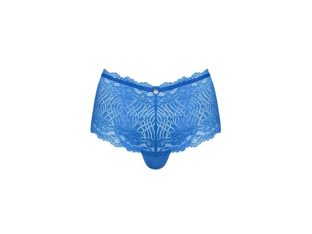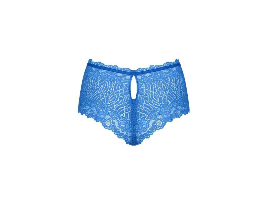 Sexy modré šortky. Fenomenální kombinace krásné barvy, průhledného vzoru a krajky. Odhalují hýždě jako tanga. Ozdobný průstřih na zadní straně a přívěsek na šperky na přední straně. Příjemný a pružný materiál, který se přizpůsobí tělu