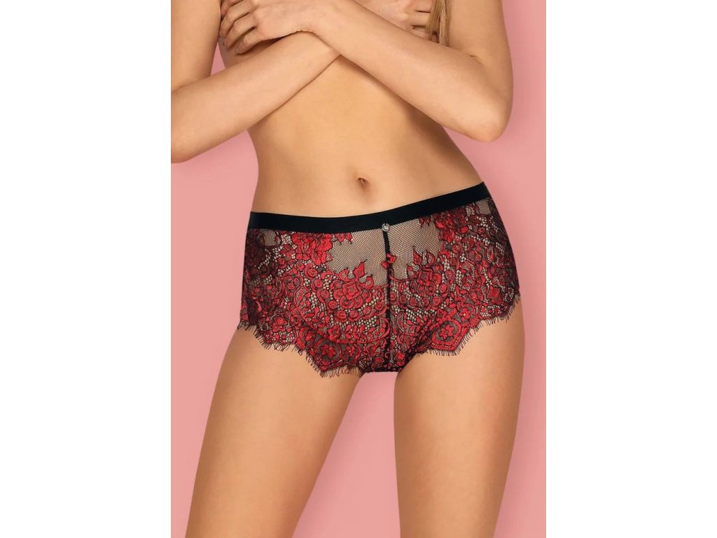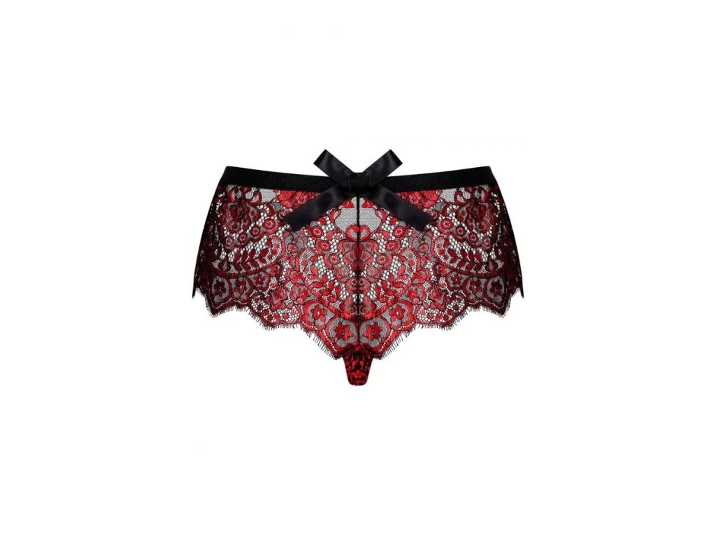 Svůdné šortky z průhledné látky. Saténová mašle nad hýžděmi - koketní vzhled! Přední díl zdobí lesklý přívěsek. Květinová krajka v červené barvě - jemně zdobí tělo. Okraje zakončené řasenou krajkou. Příjemný materiál.