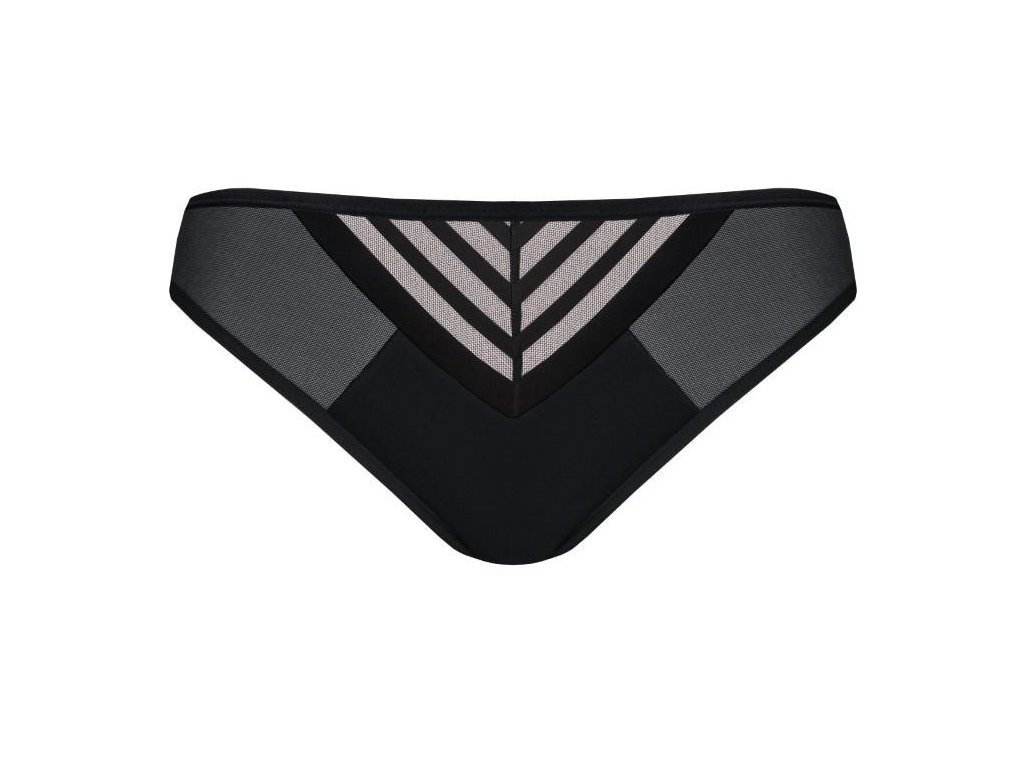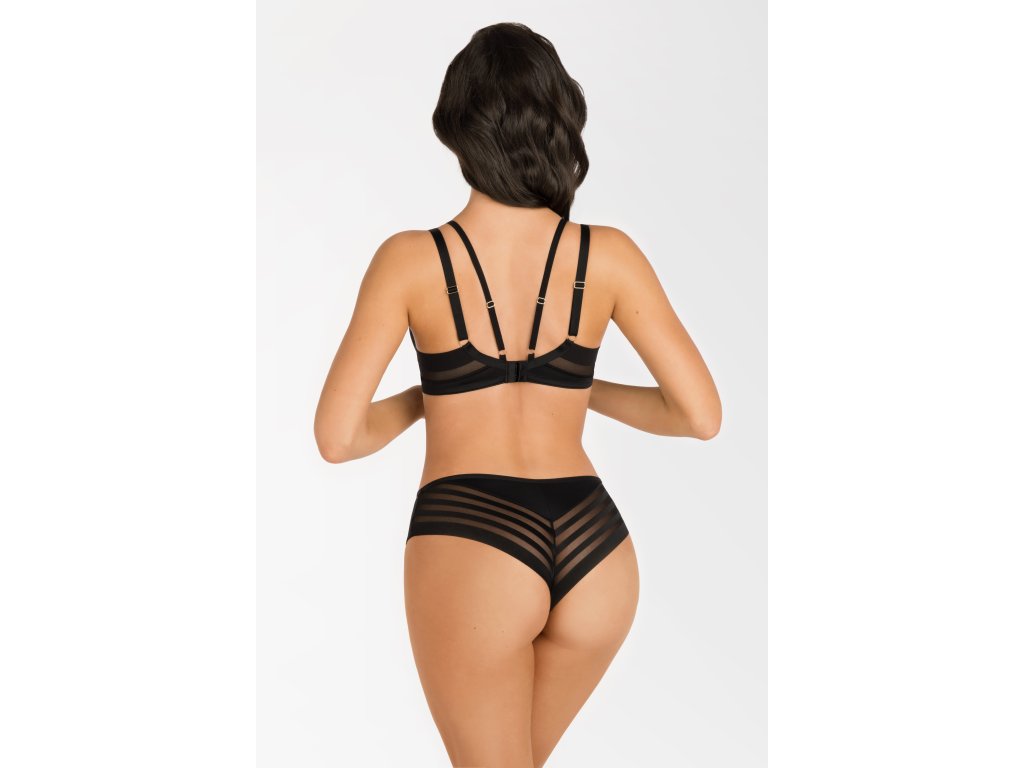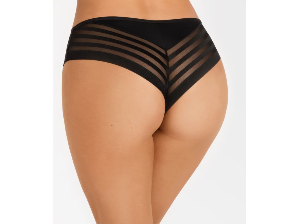 Brazilské kalhotky Yoko K812 ● nižší horní díl ● více odhaluje a zvýrazňuje hýždě ● přední díl: elastická krajka s pruhovaným motivem ● boky: elastický tyl ● spodní díl z neprůhledného mikrovlákna ● nohavičky zakončené úzkou gumičkou ● zadní díl: nohavičky zakončené krajkovým lemem, horní díl s vložkou z neprůhledného mikrovlákna ● pas zakončený širší gumičkou