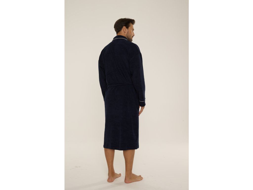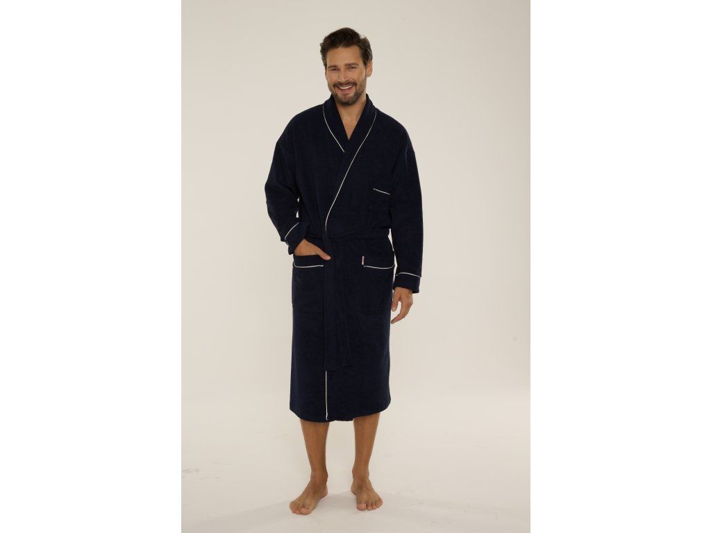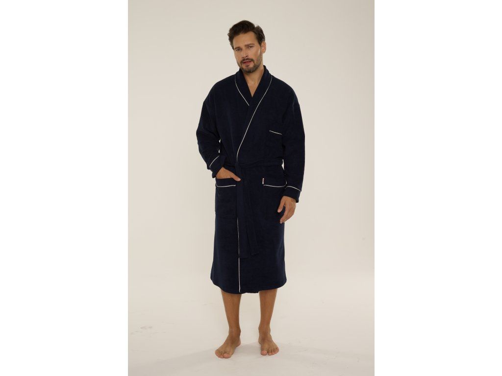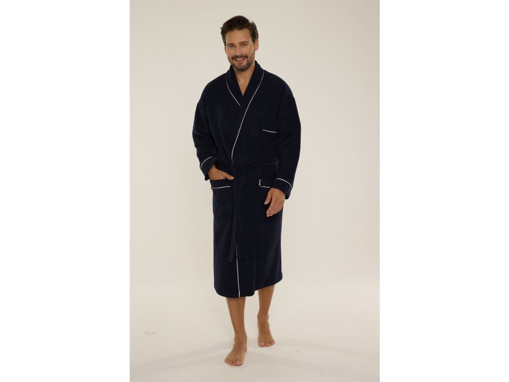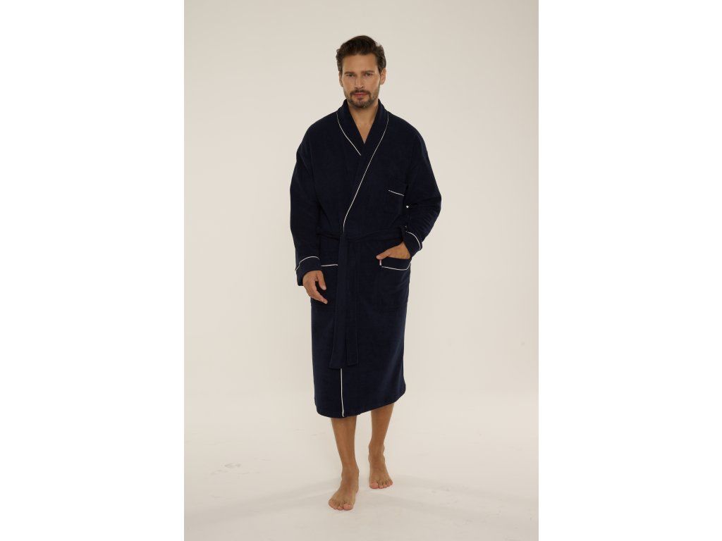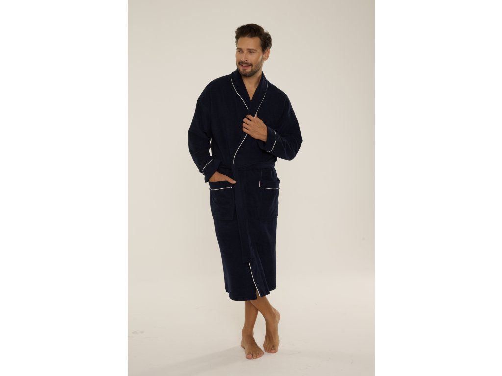 Pánský župan Laurent 048 ● elegantní dlouhý župan klasického střihu ● z měkkého froté ● tenká fleecová vrstva na vnitřní straně pro větší teplo ● šálový límec podtrhuje elegantní charakter modelu ● zavazování v pase pro pohodlné nošení ● praktické kapsy na úrovni boků ● manžety a kapsy zakončené kontrastním lemováním ● ideální po koupeli a pro každodenní domácí relaxaci