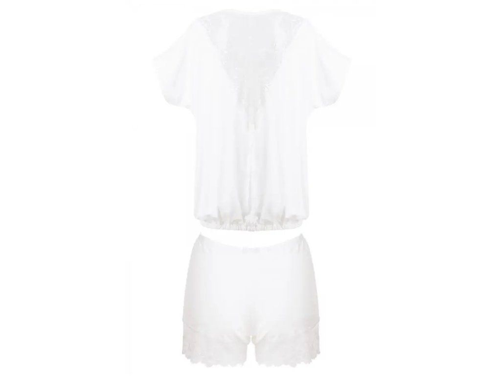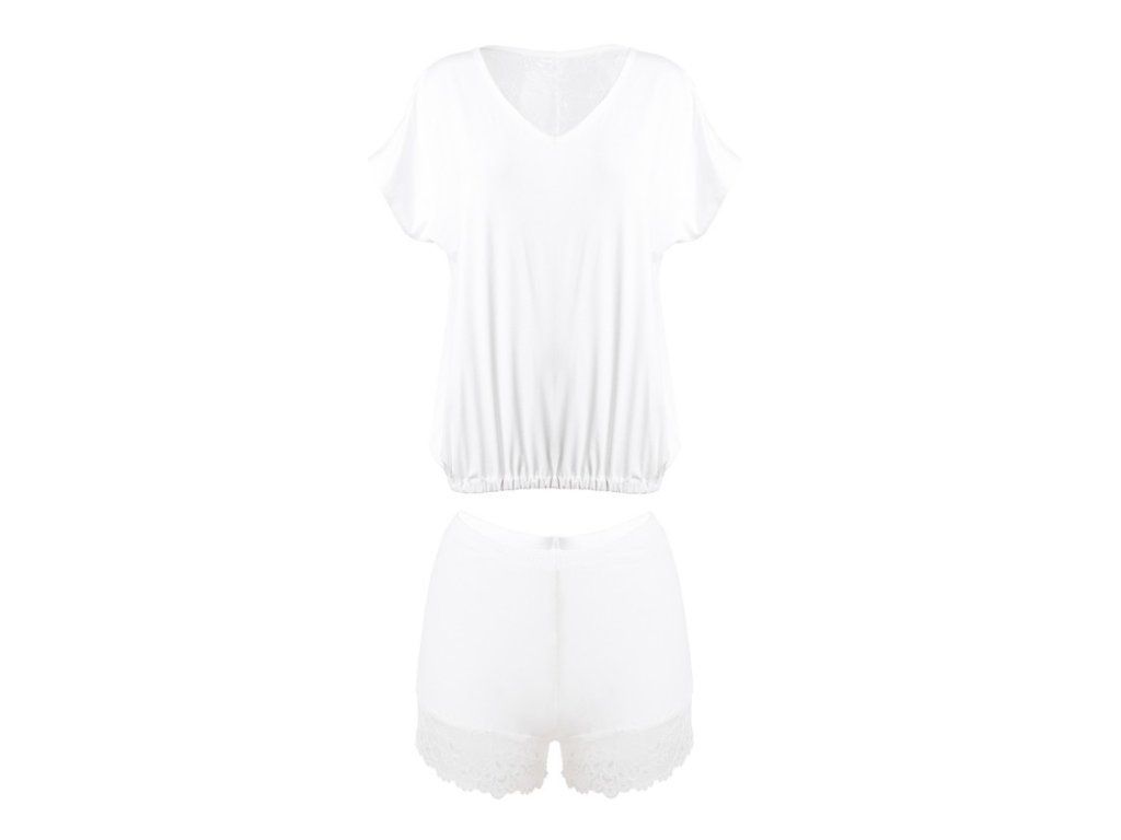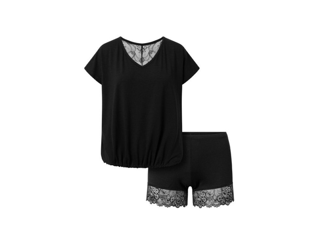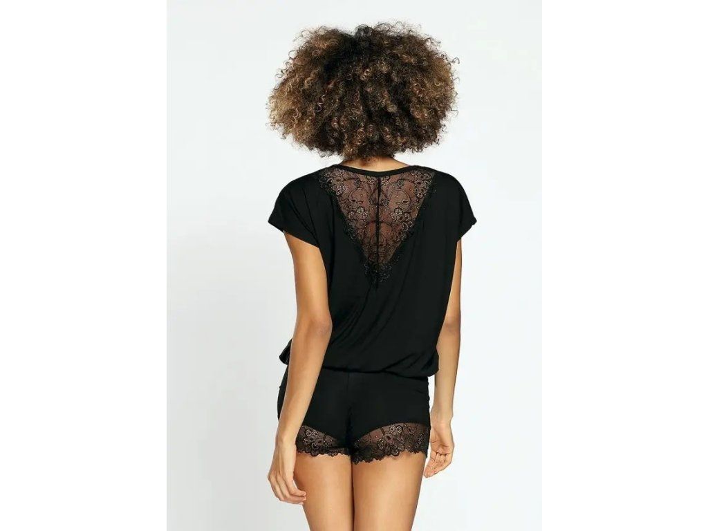Souprava Tamara ● elegantní pyžamo z viskózy, která je příjemná na dotek ● skládá se z volného trička s žebrovaným lemem a krátkých šortek ● zadní část trička a šortek zdobí krásná vzorovaná krajka ● pohodlný střih vám umožní stylově relaxovat ● vyrobeno z vysoce kvalitních materiálů