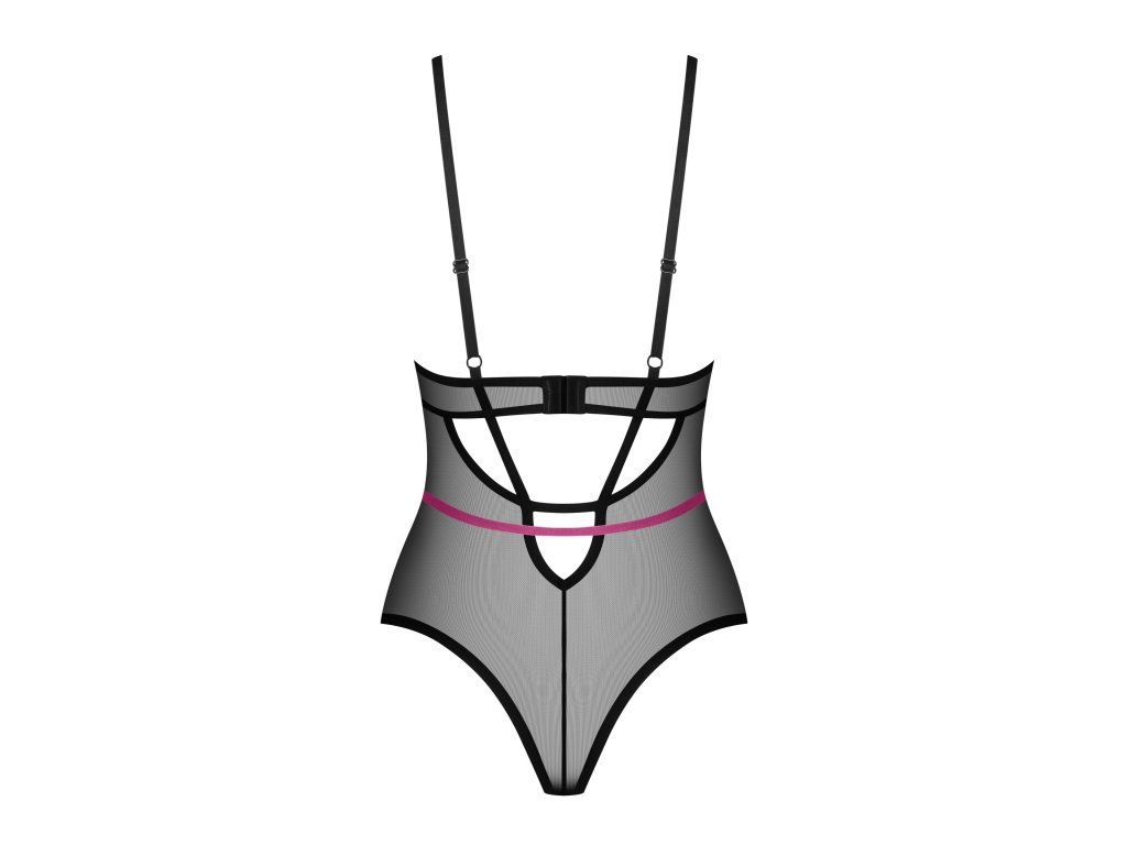 Body Novenes ● sexy minimalismus s fialovými detaily ● z průhledného úpletu s ramínky ● klasický vypasovaný střih ● vysoký střih na hýždích ● kostice v košíčcích ● třístupňová regulace v rozkroku ● nastavitelná ramínka a zapínání ● fialová ramínka lehce obepínají pas ● třpytivý přívěsek s černými zirkony