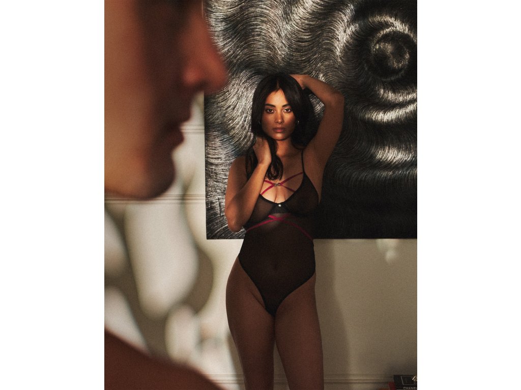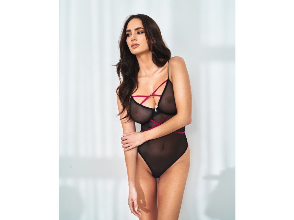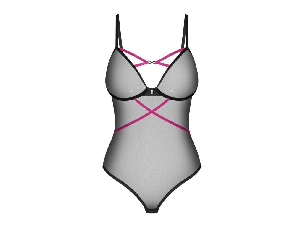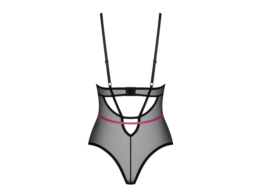 Body Novenes ● sexy minimalismus s fialovými detaily ● z průhledného úpletu s ramínky ● klasický vypasovaný střih ● vysoký střih na hýždích ● kostice v košíčcích ● třístupňová regulace v rozkroku ● nastavitelná ramínka a zapínání ● fialová ramínka lehce obepínají pas ● třpytivý přívěsek s černými zirkony